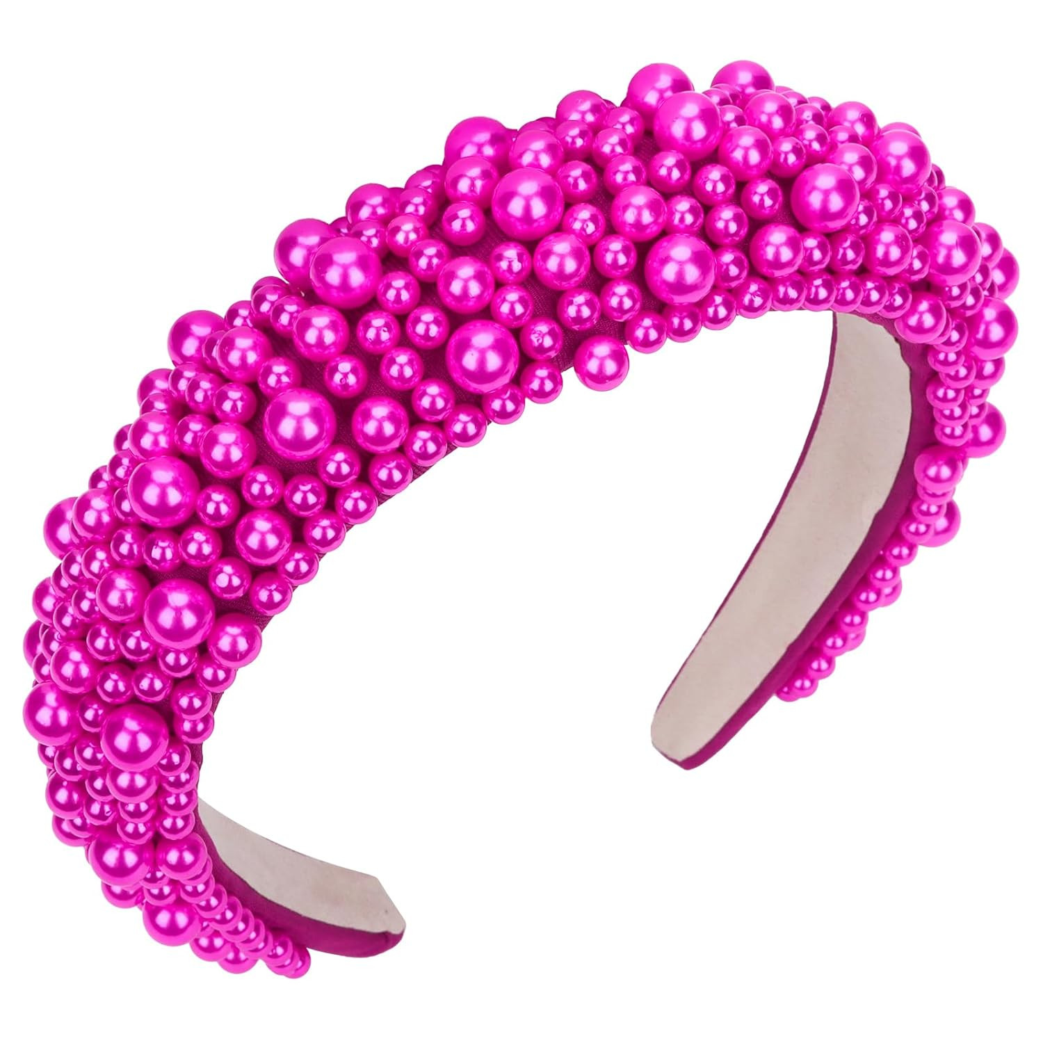 1pc Pearl Headband - Hot Pink Fancy Puffy Headband, Thick Beaded Padded Hair Acc