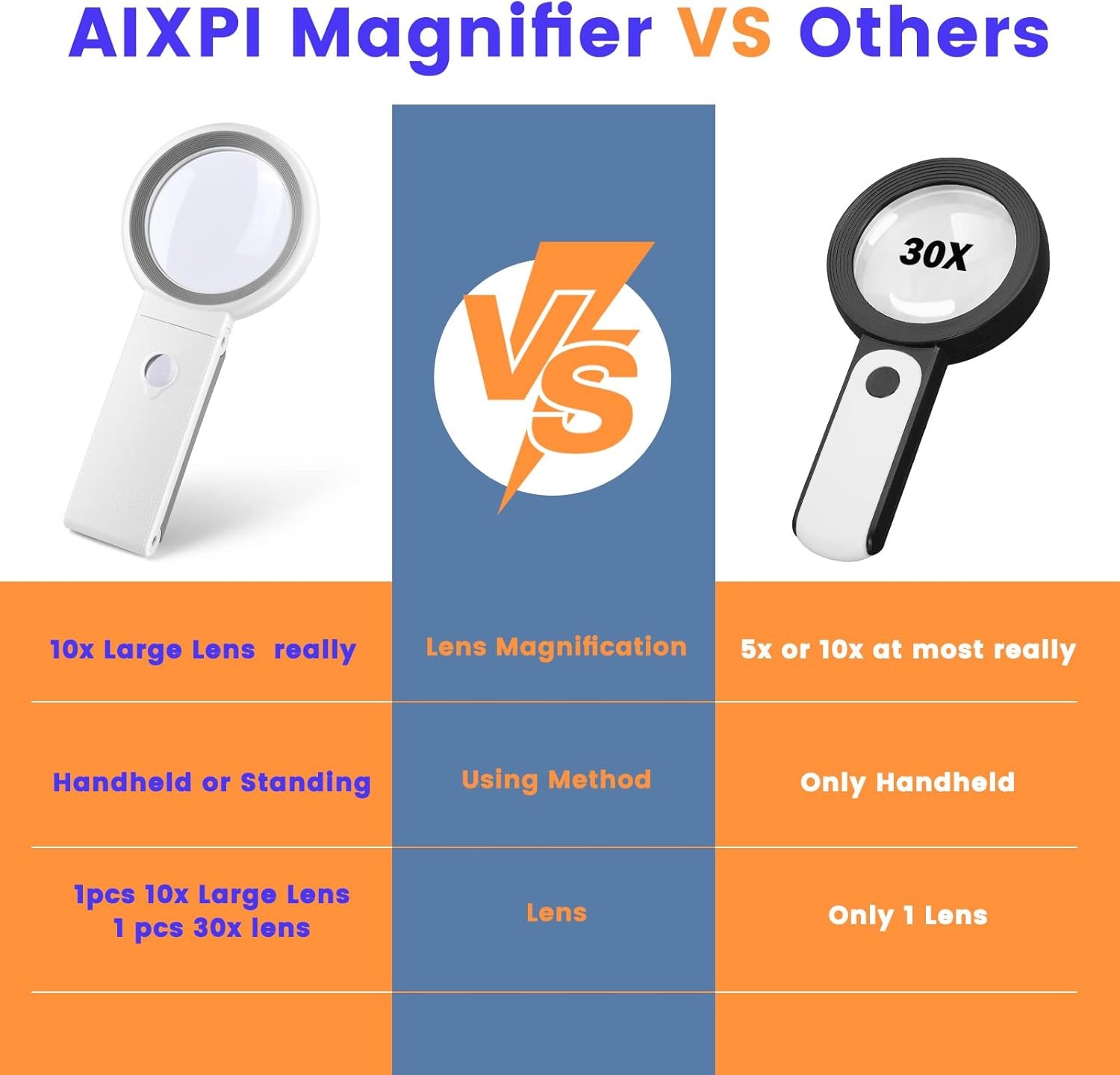 • 30X 10X Magnifying Glass with Light and Stand, Large Lighted White