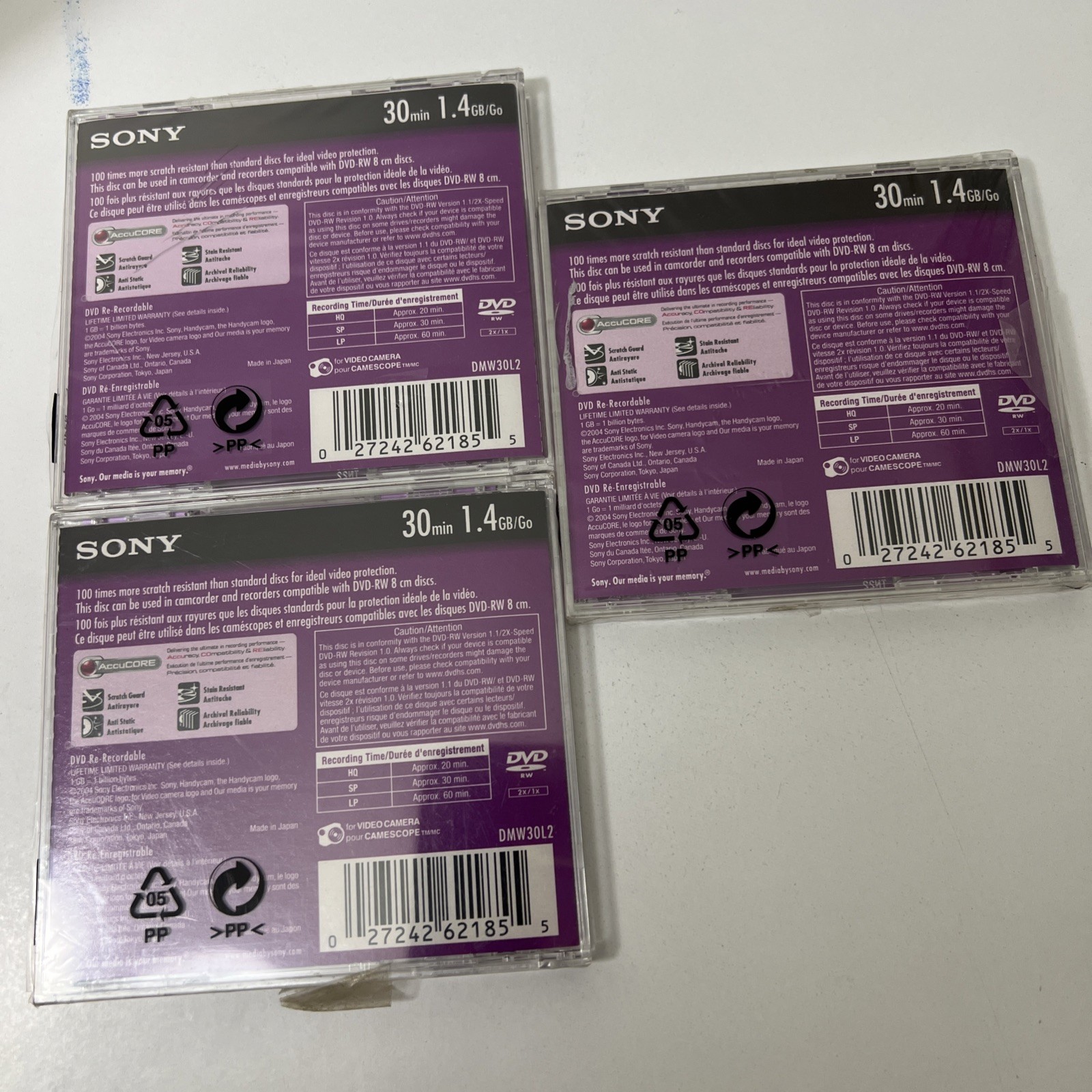 3 Sony Handycam DVD-RW 30min 1.4GB Single Sided Disc New Re-recordable Read Desc