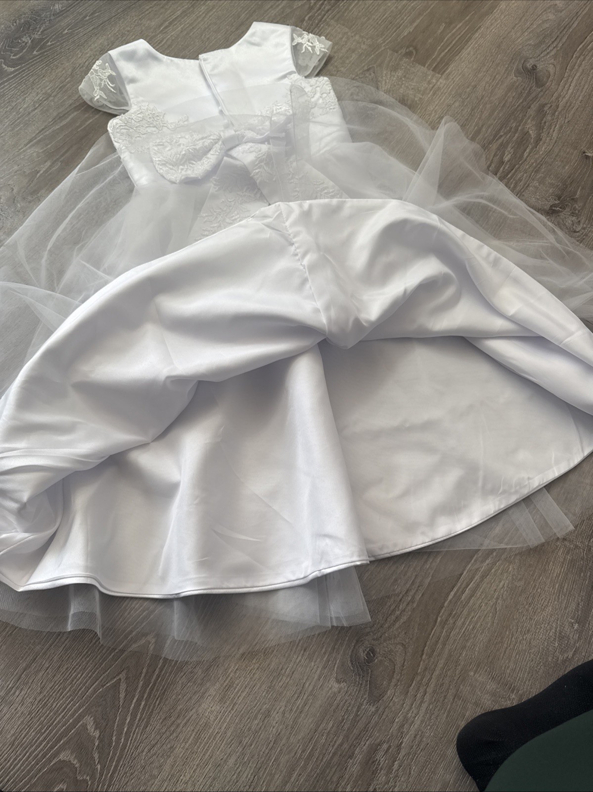 как выглядит Girls White Floral Lace Tulle Bow Button Accent Dress Size 8 фото