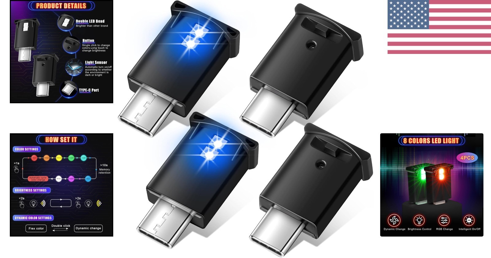 как выглядит Set of 4 Mini USB LED Lights - 8 Color Adjustable Brightness for Car Office фото