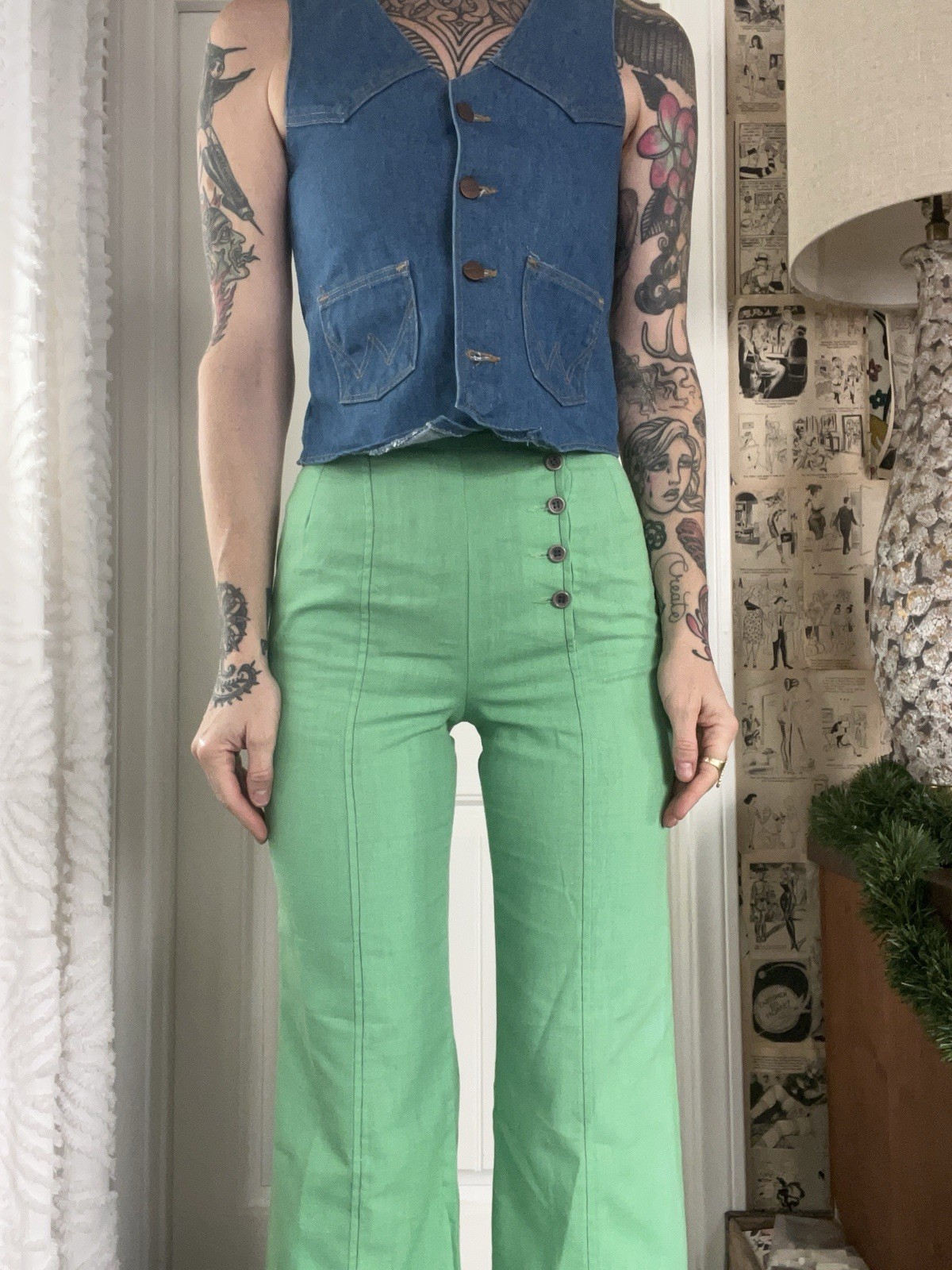 как выглядит Vtg 70s Lady Wrangler Green High Rise Bell Bottoms Side Button Groovy Retro XS фото