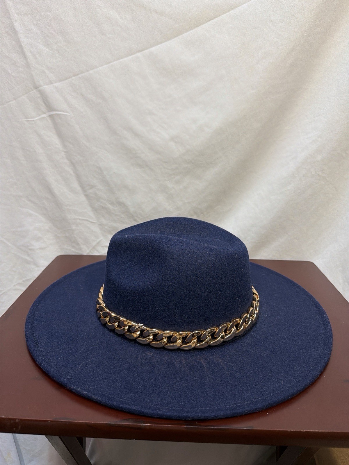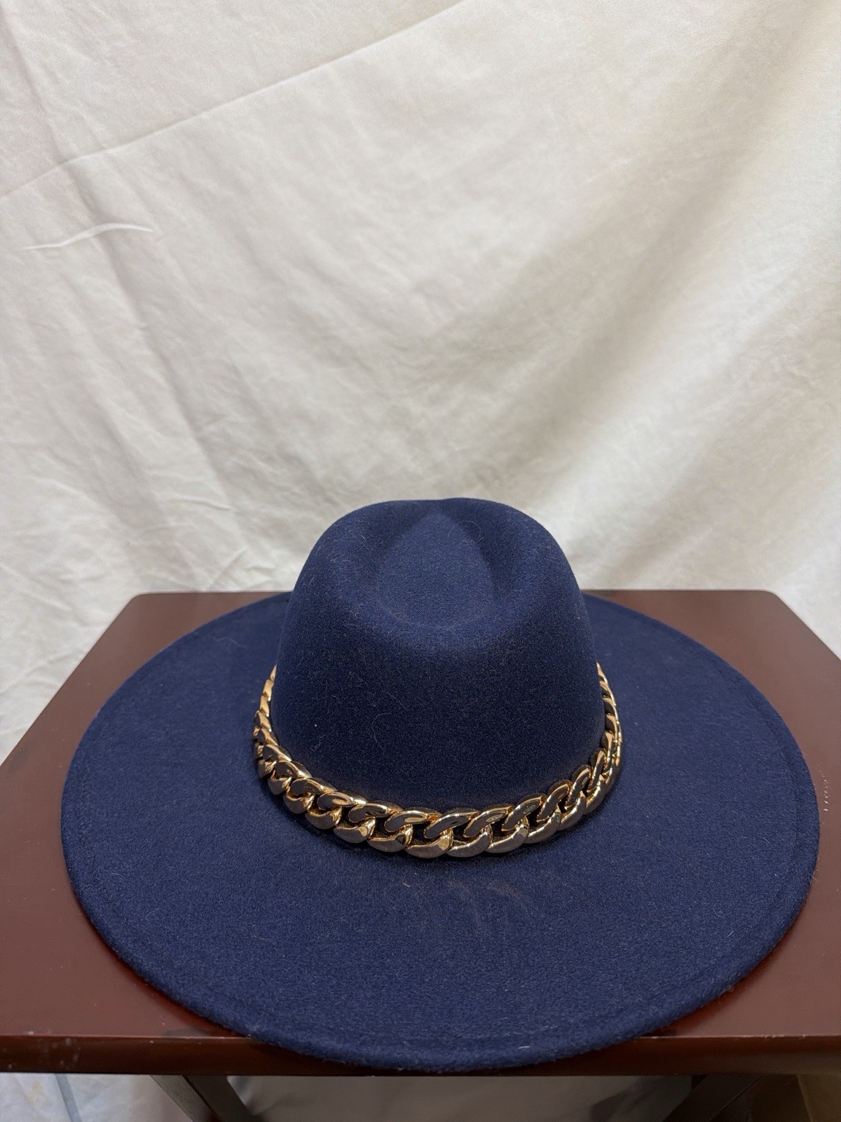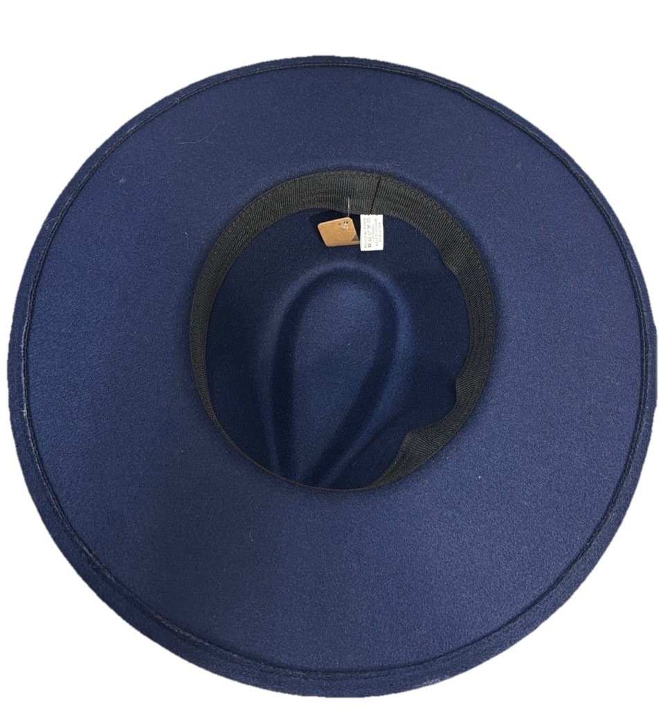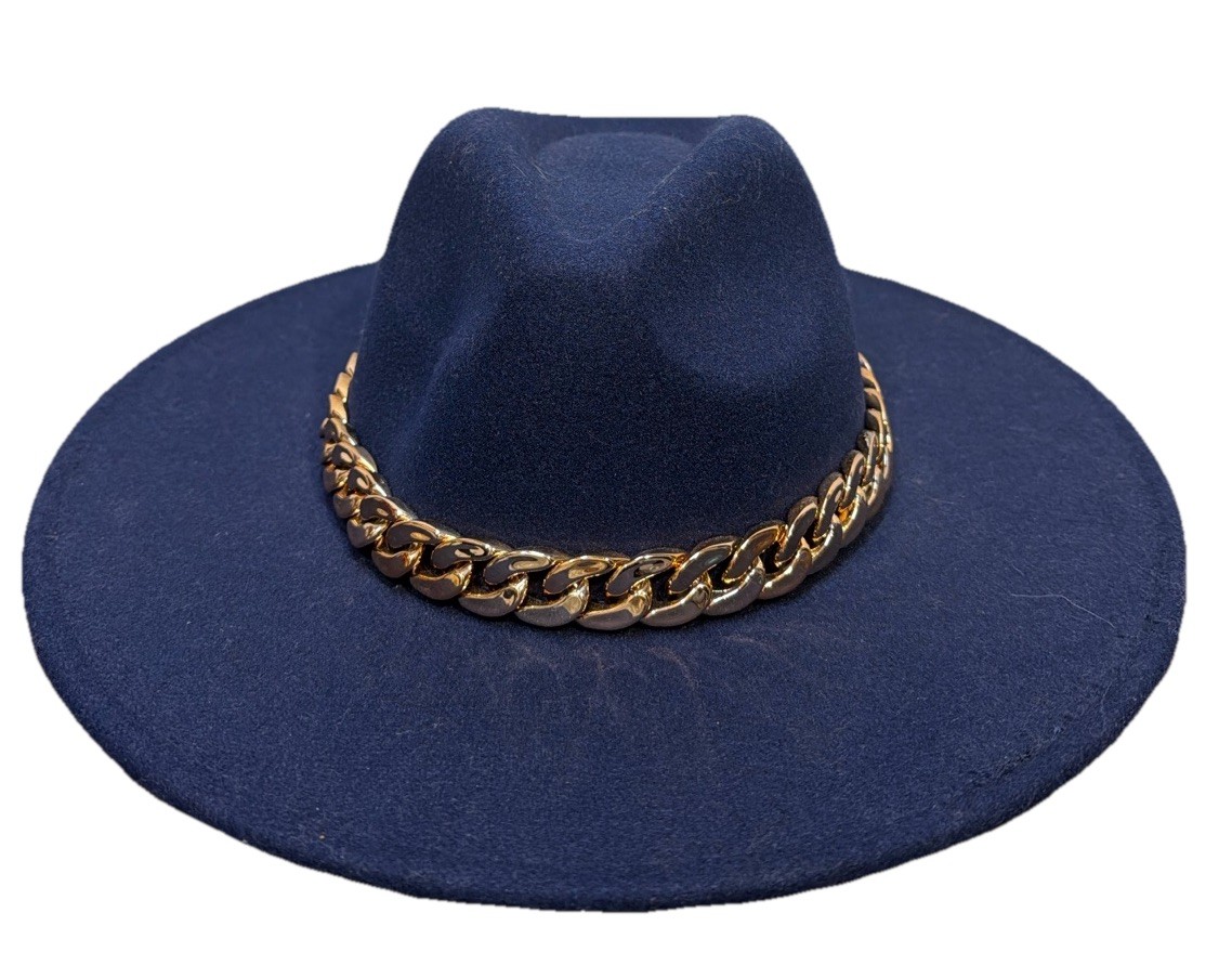 Navy Blue Wide Brim Fedora Gold Chain Rancher Style Hat