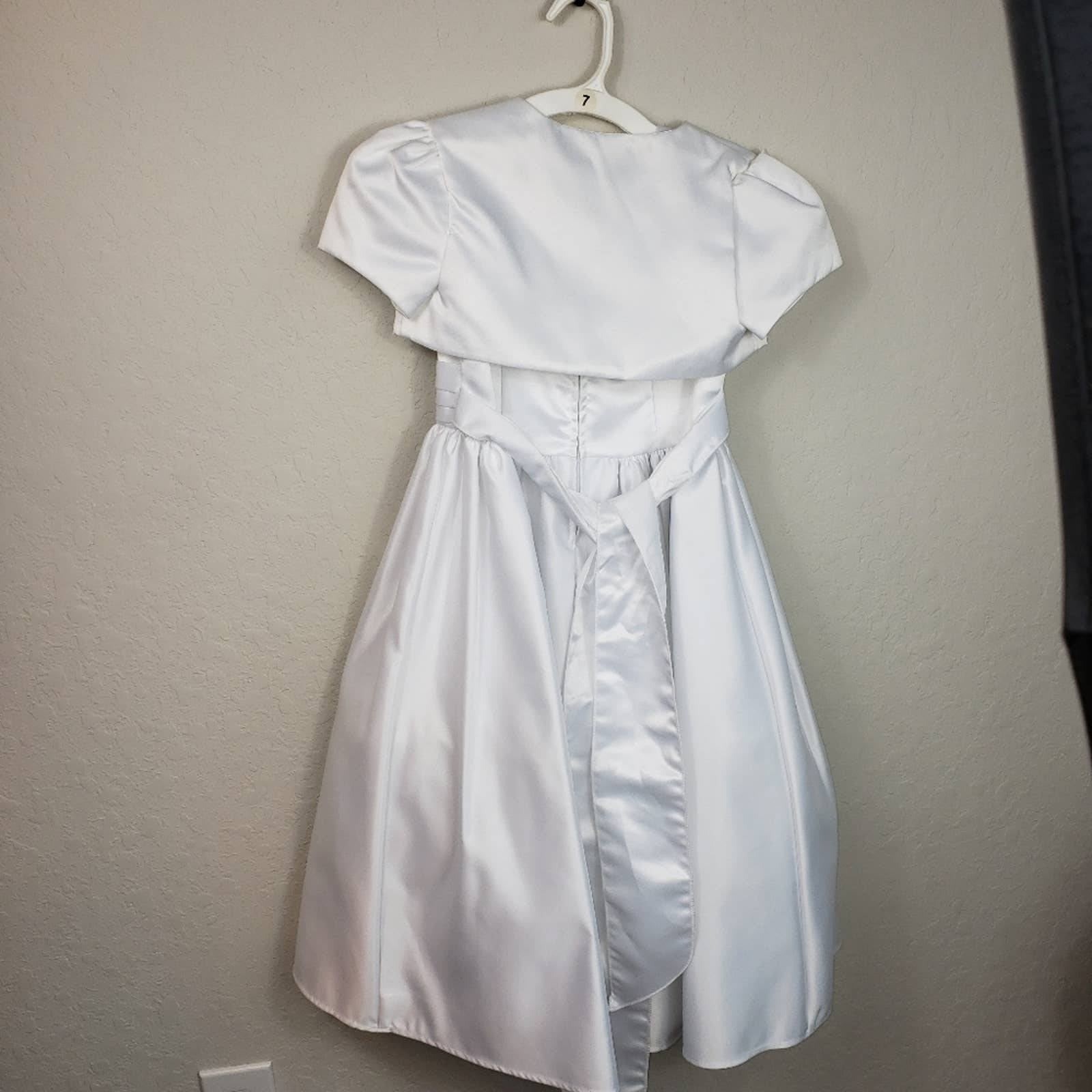 как выглядит Girls White Satin Dress with Bolero Jacket Flower Sash Special Occasion Formal фото