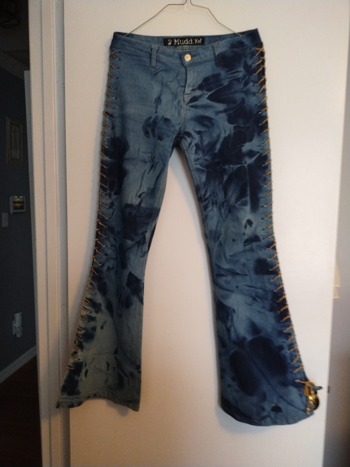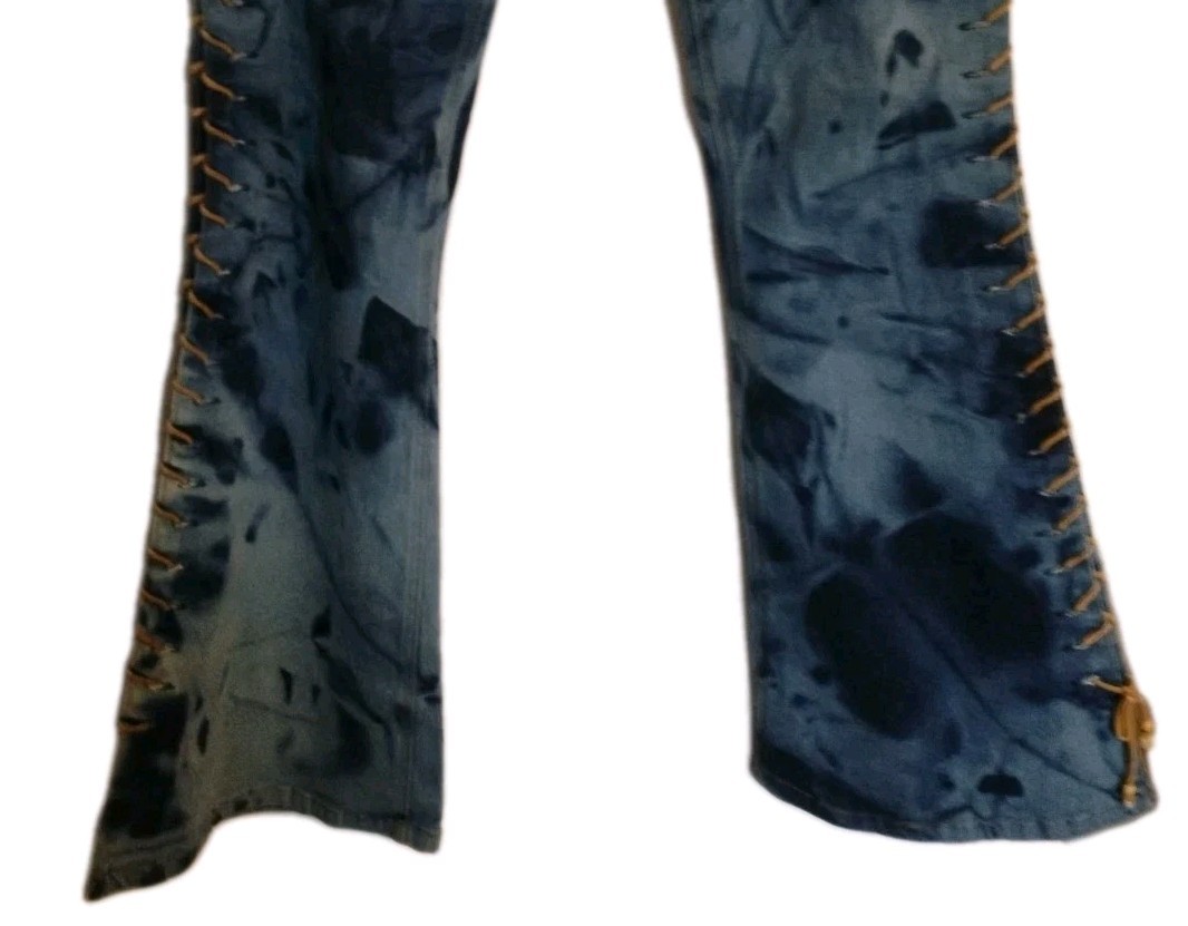 как выглядит VTG Y2K Mudd Yo Lace Up Leg Jeans Low Rise Flare Bell Bottoms Tie dyed Junior 7 фото