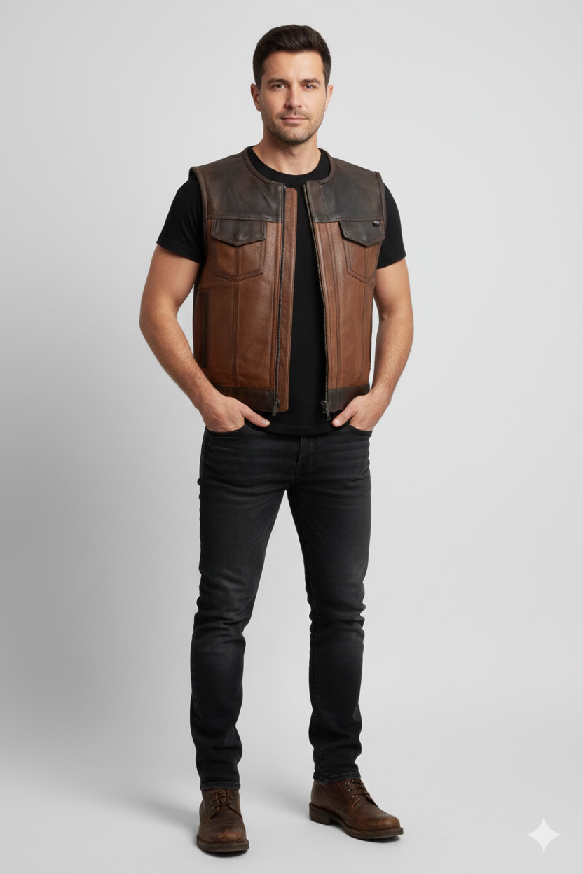 Men s Brown Leather Motorcycle Vest Distressed Biker Sleeveless Riding Waistcoat