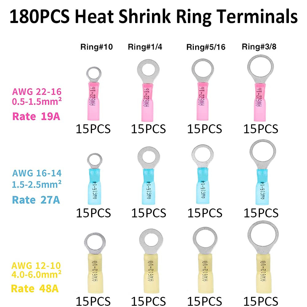 180 PCS Heat Shrink Wire Connectors, Ring Terminals Kits, Automotive Marine Ring