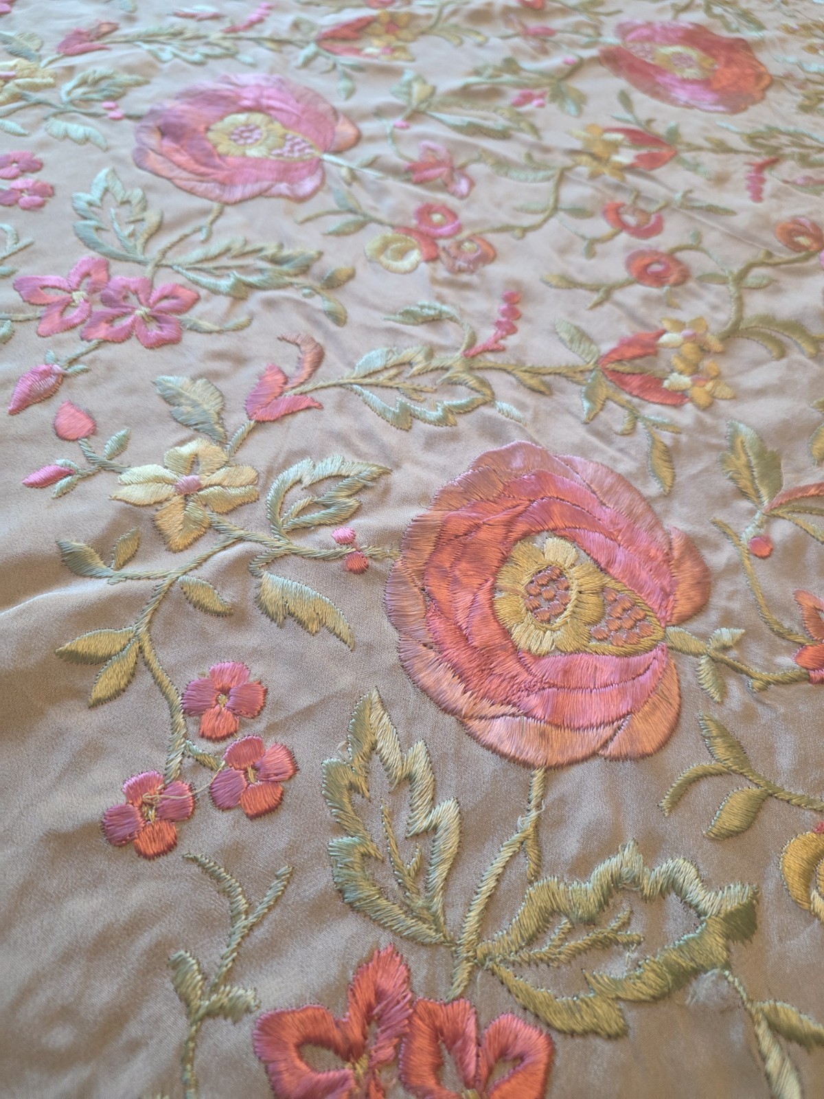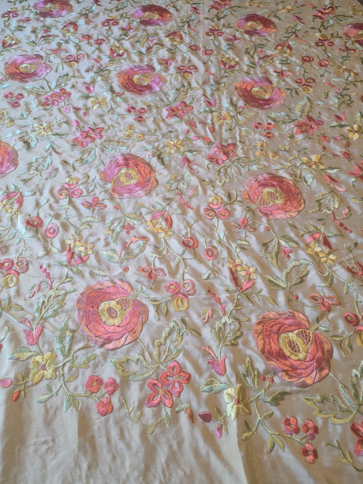 • Antique Silk Beige/Ecru Piano Scarf Pink Embroidery Flowers 46x50" 17" Fringe