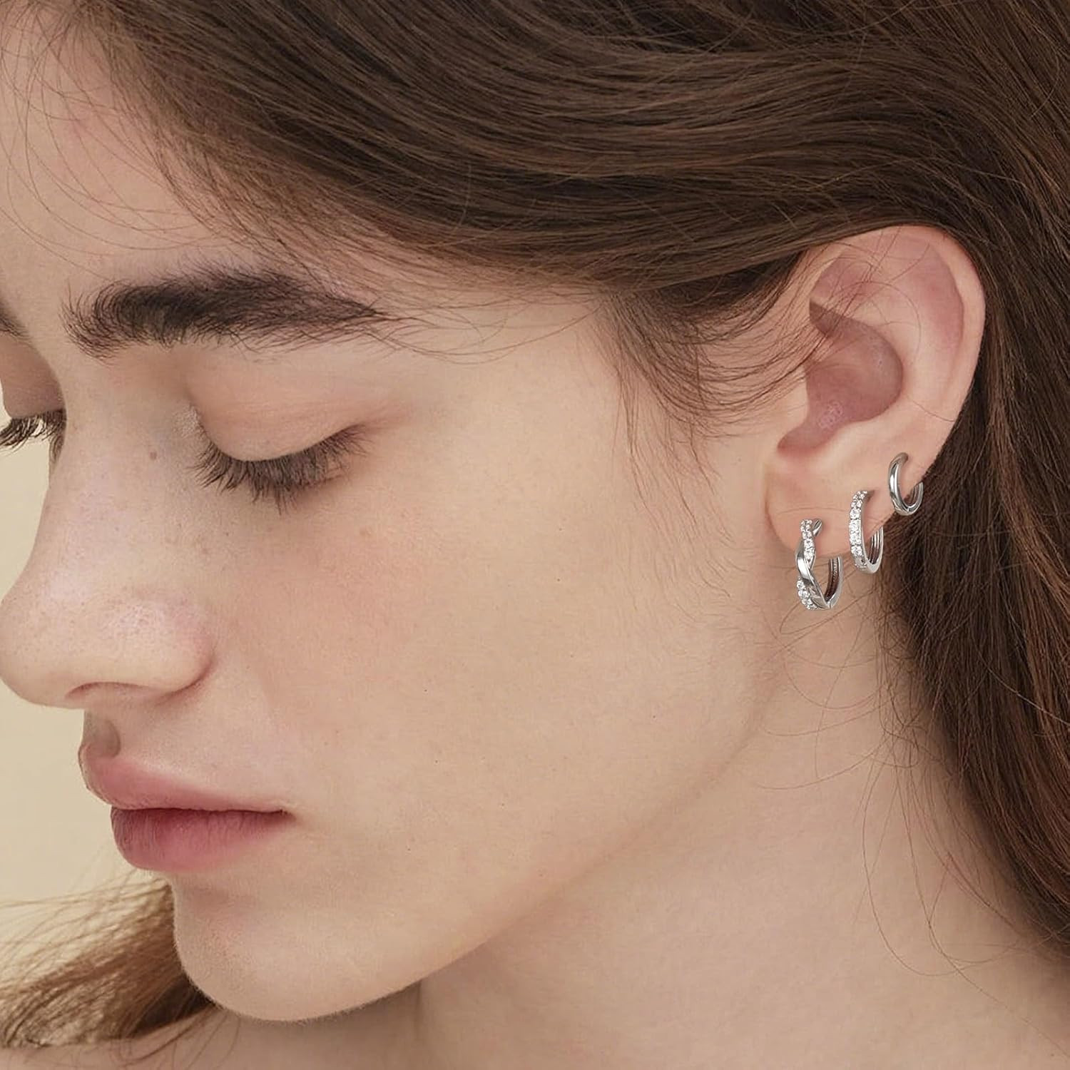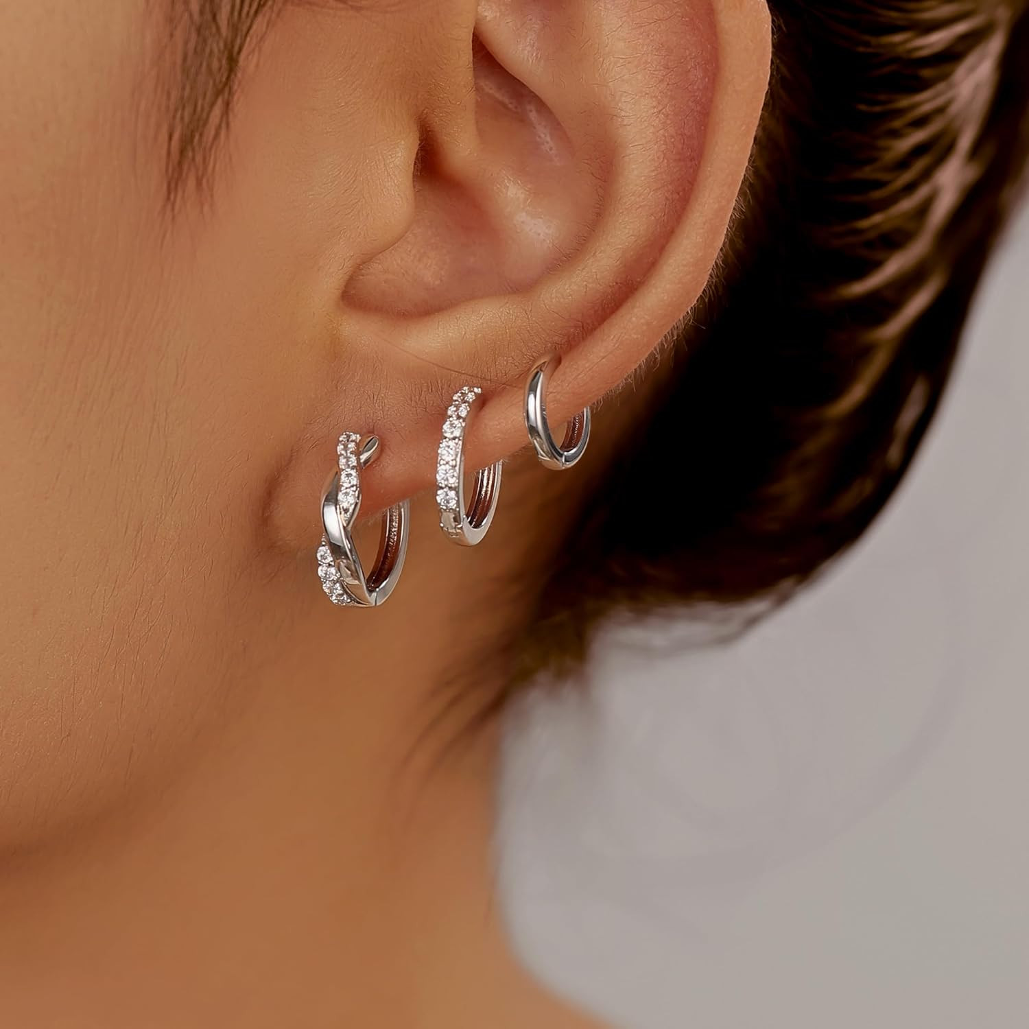 как выглядит 3 Pairs Silver Hoop Earrings Set: 925 Sterling Silver Dainty Stud Earrings Trend фото