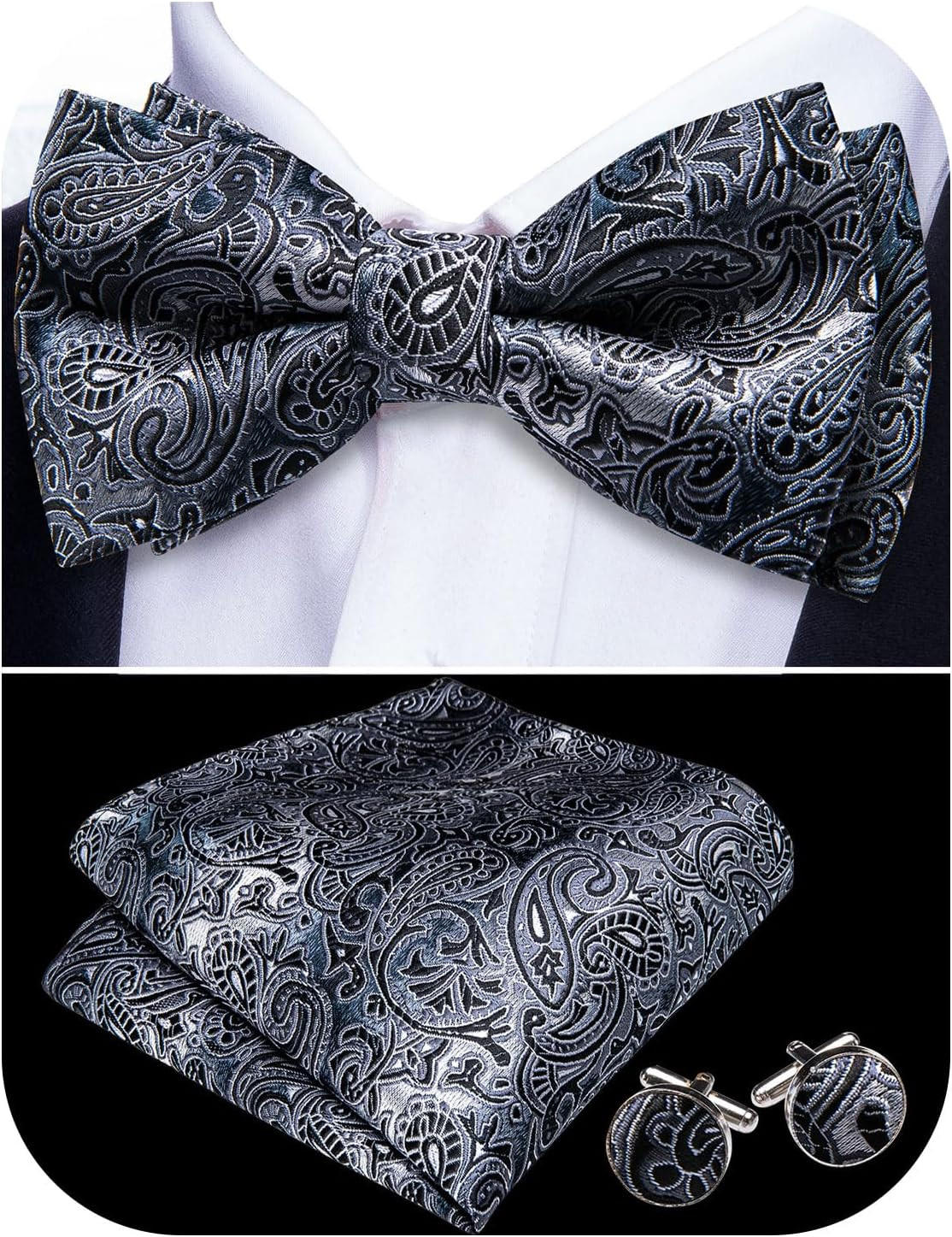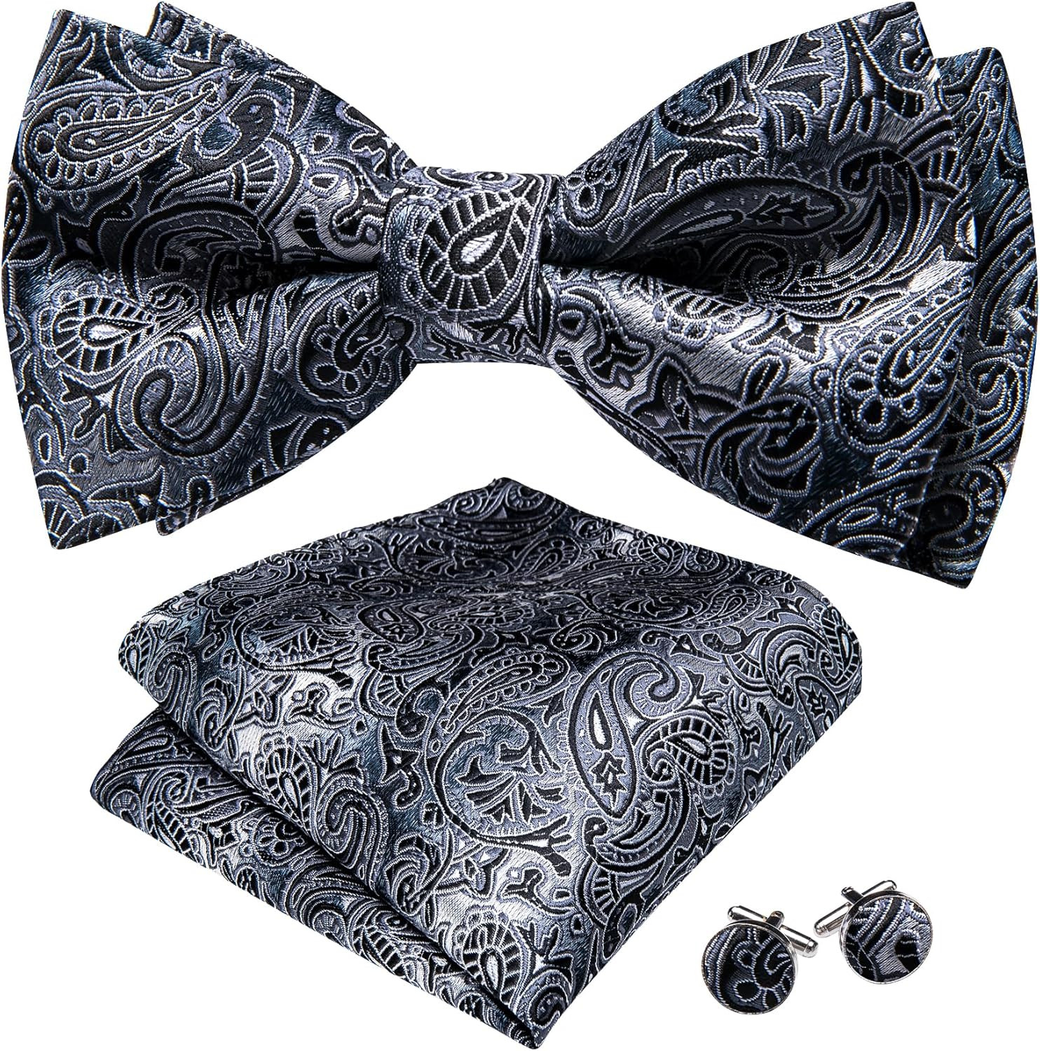 Paisley Striped Bow Tie for Men Silk Pre-Tied Bowtie Pocket Square Cufflinks Set