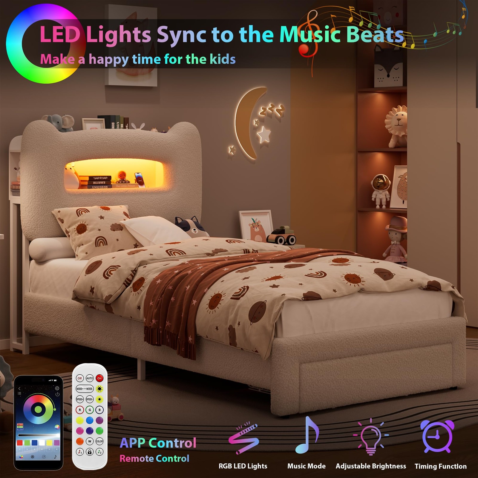 Twin Size LED Upholstered Bed Frame Platform Kids w/Storage Headboard Drawers