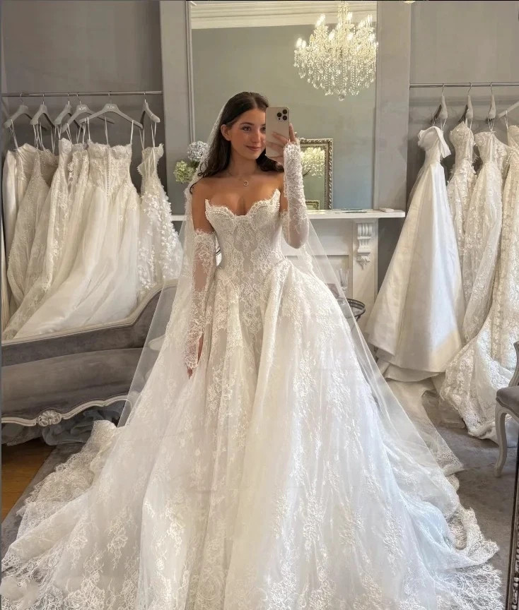 как выглядит Appliques Wedding Dresses with Detachable Sleeves Chapel Train Bridal Gowns фото