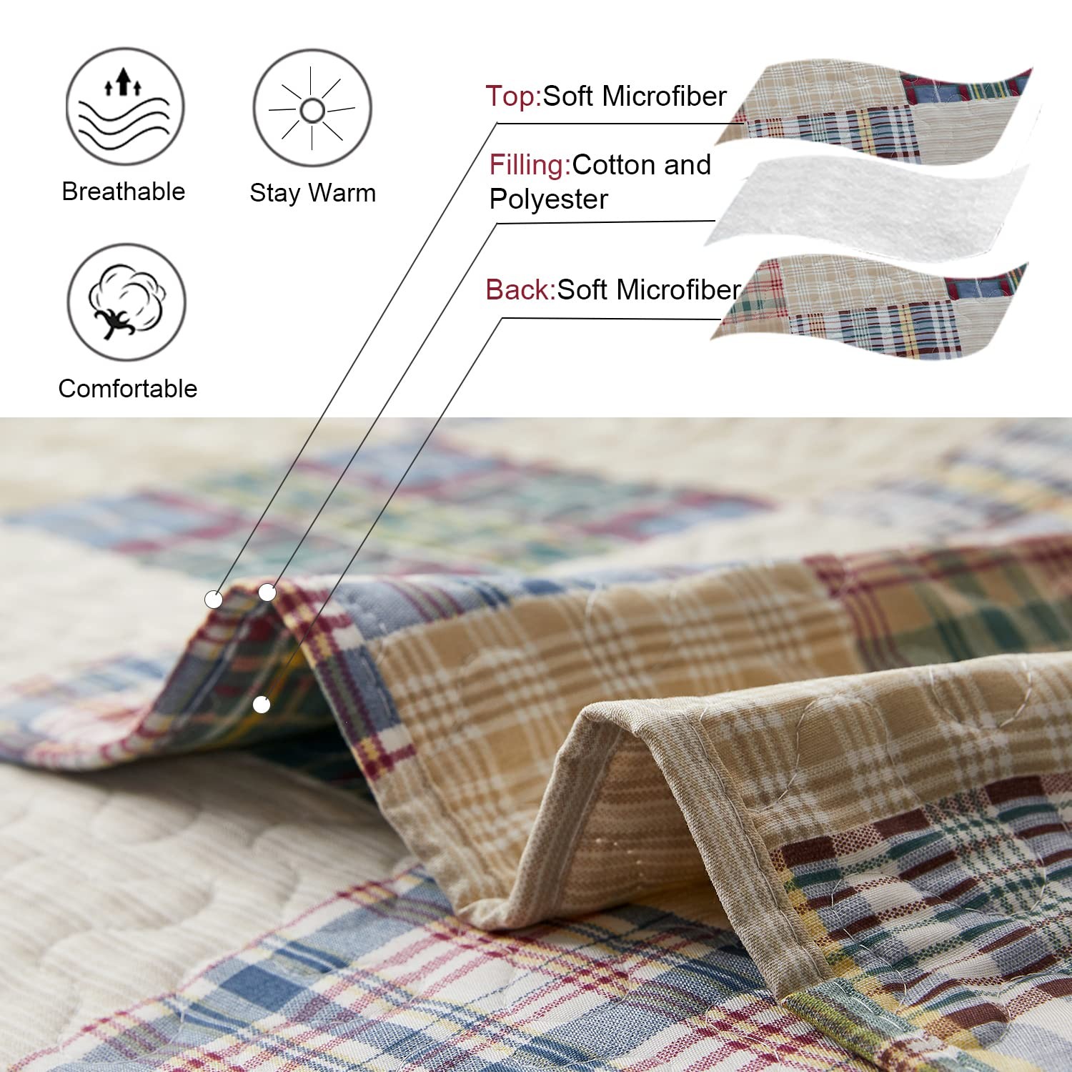Beige Plaid Quilt Set King Size Patchwork Quilts Bedding Plaid Reversible Bed...
