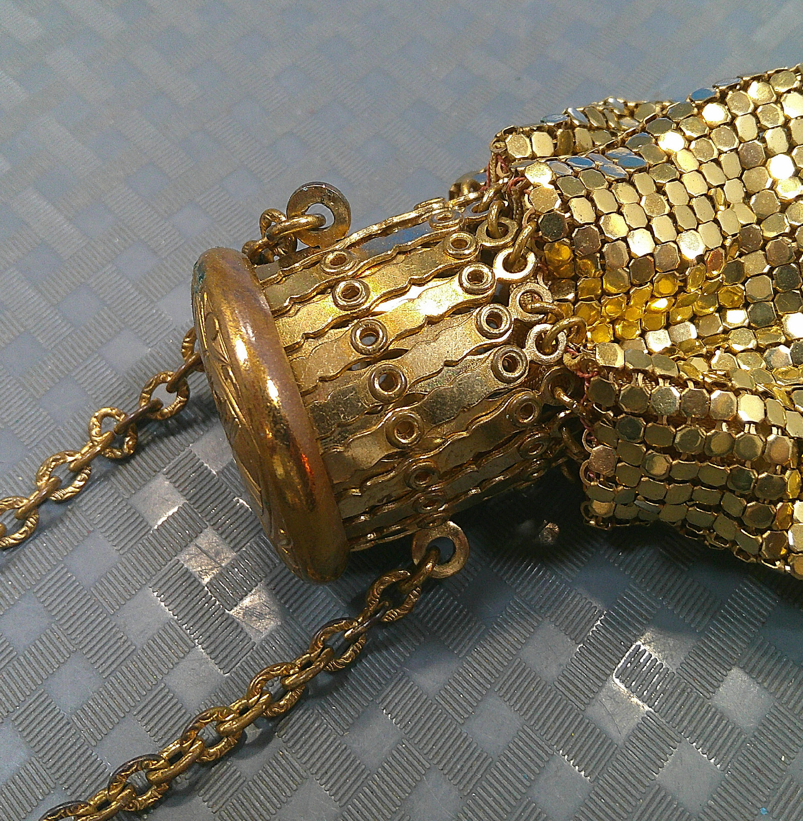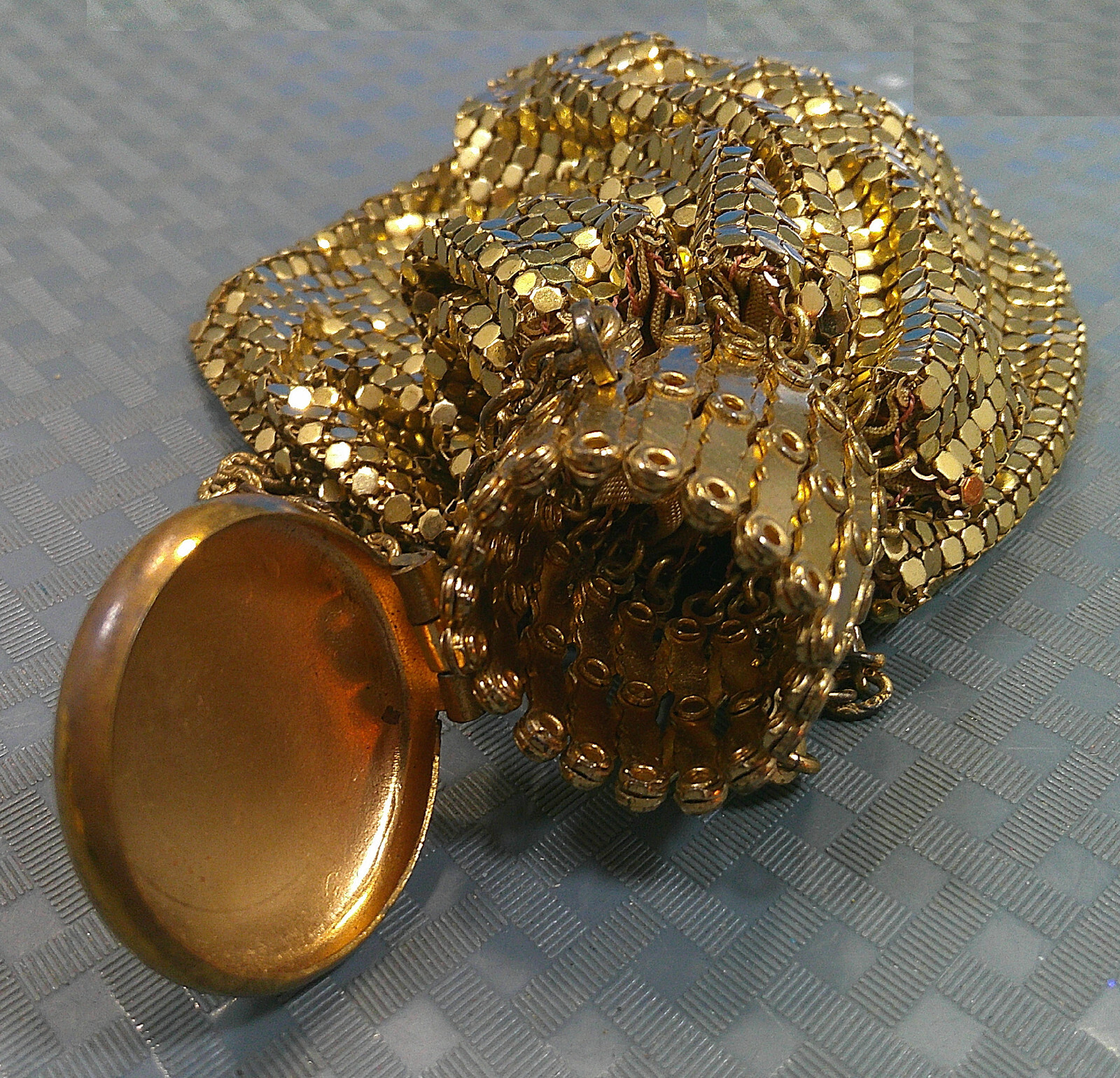 Vintage 1920s Whiting Davis Mesh Beggar's Bag Purse Expandable Neck Gold Metal