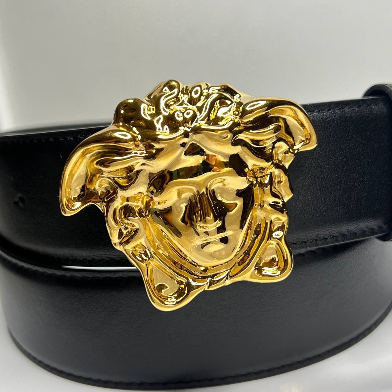 Authentic VERSACE gold medusa men's belt black calfskin leather