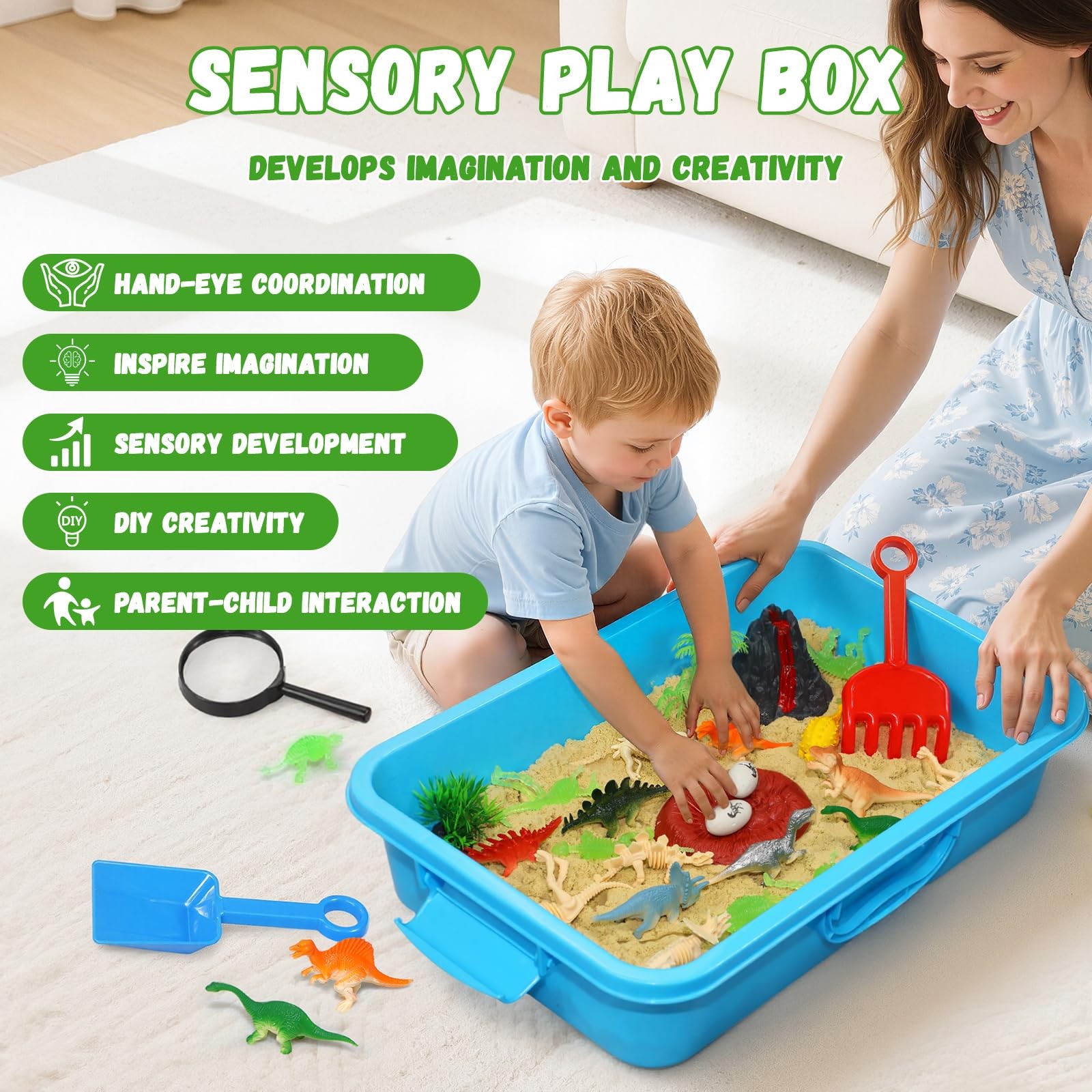 Dinosaur Sensory Bin with Lid, 2.64lbs Magic Sand, Dino Figures Skeletons, ...