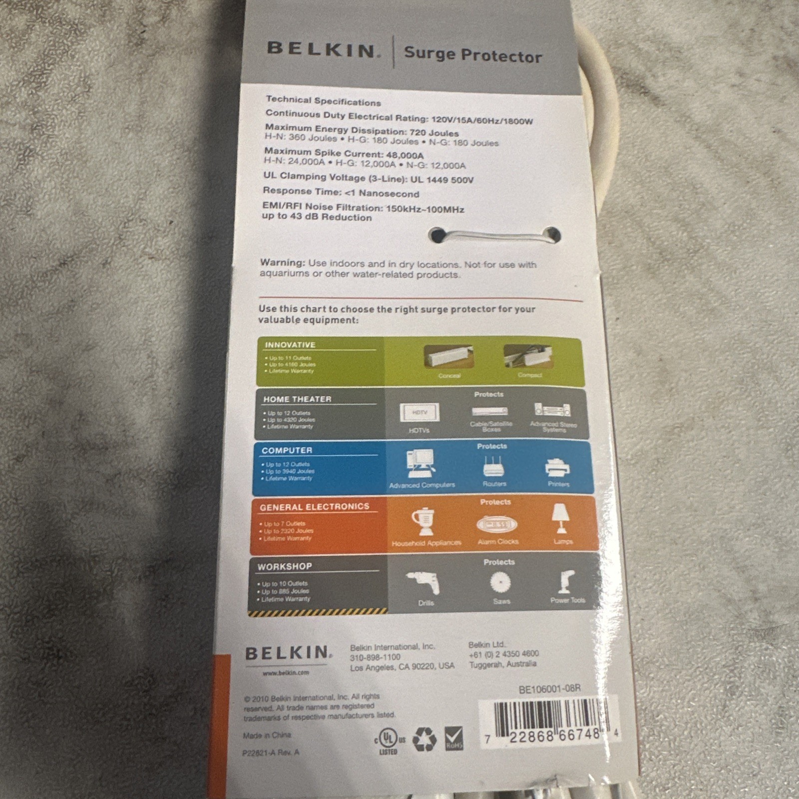 Belkin Be106001-08R 6 Outlet Surge Protector with 8 Ft. Cord Brand NEW NIB