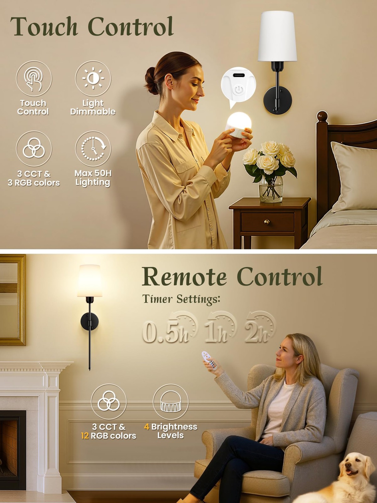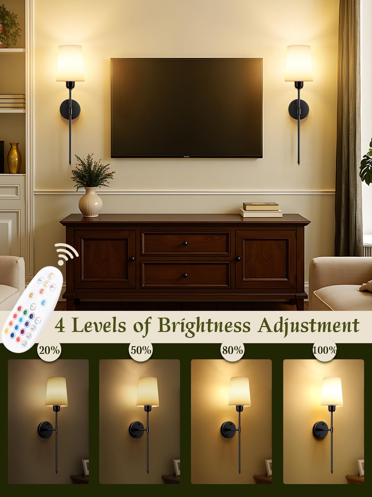 Wireless Wall Sconces Set of 2 Battery Operated, Black Wall Lights with Recha...