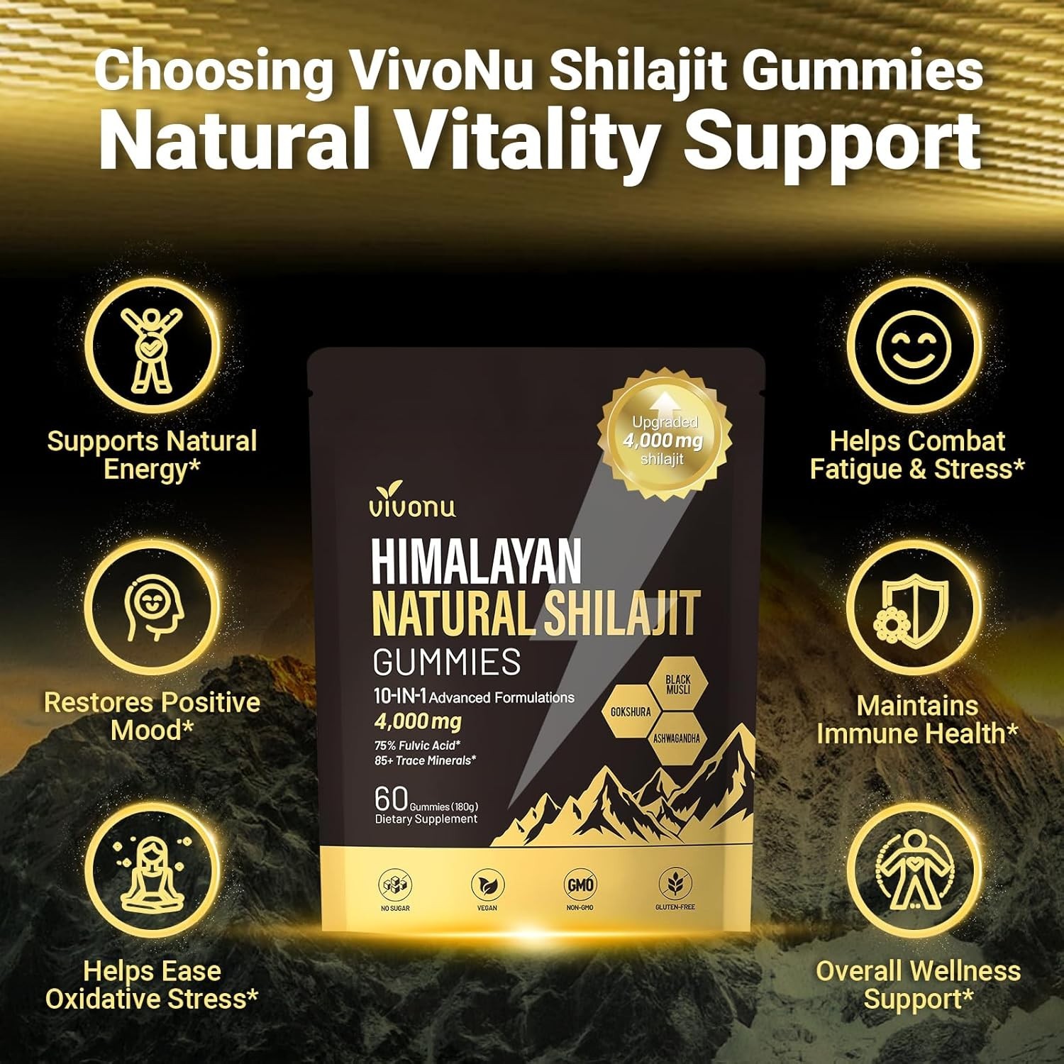 VivoNu Himalayan Shilajit Gummies 3000mg, Ashwagandha, Fulvic Acid, 60 Count