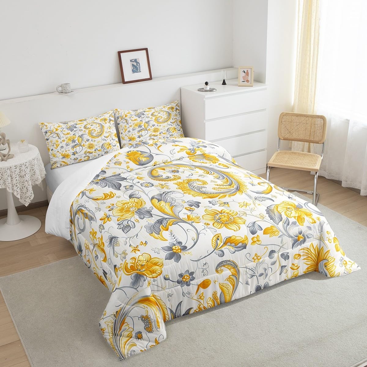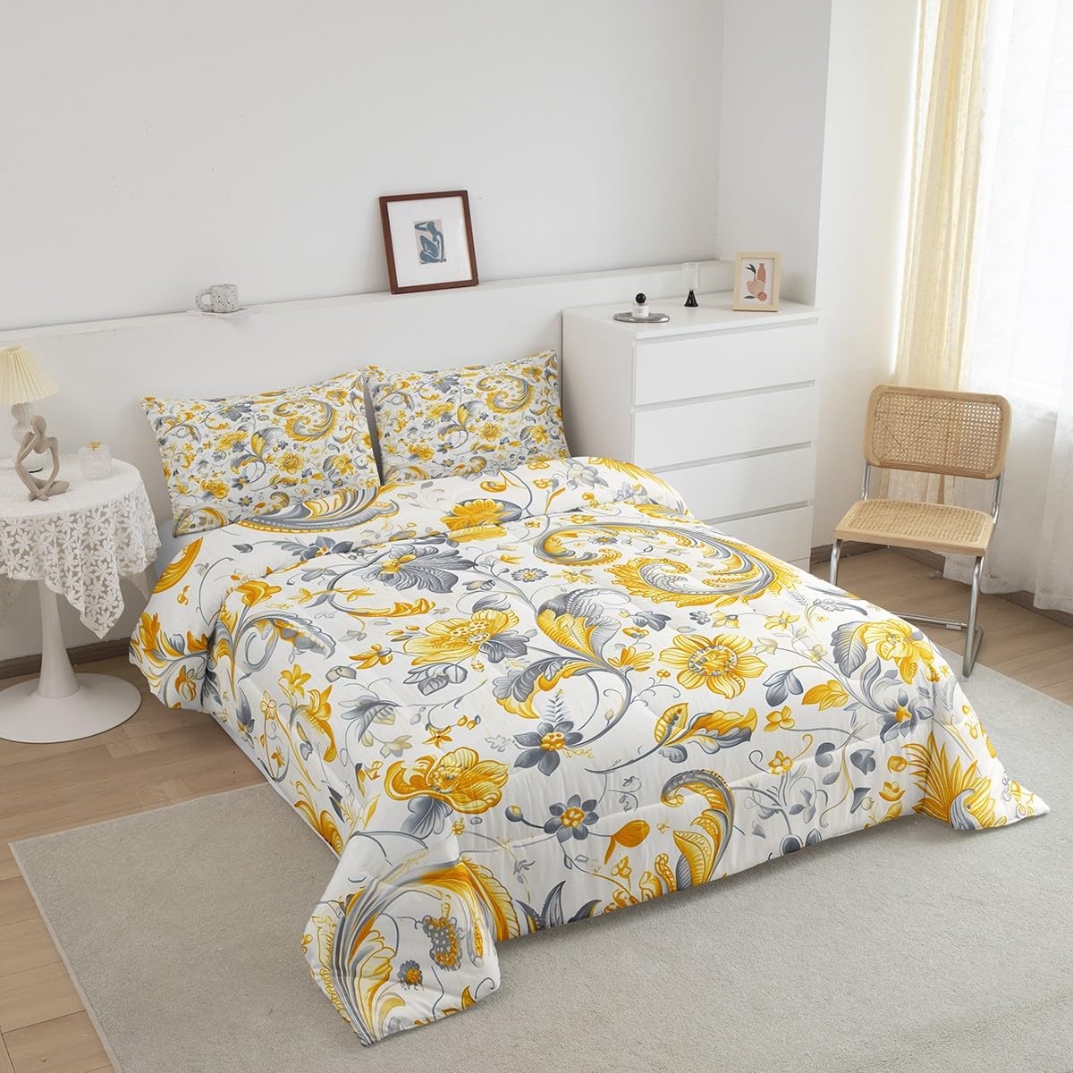 как выглядит Yellow Gray Flowers Comforter Set Full Size 3 Pcs,Botanical Garden Vinatage B... фото