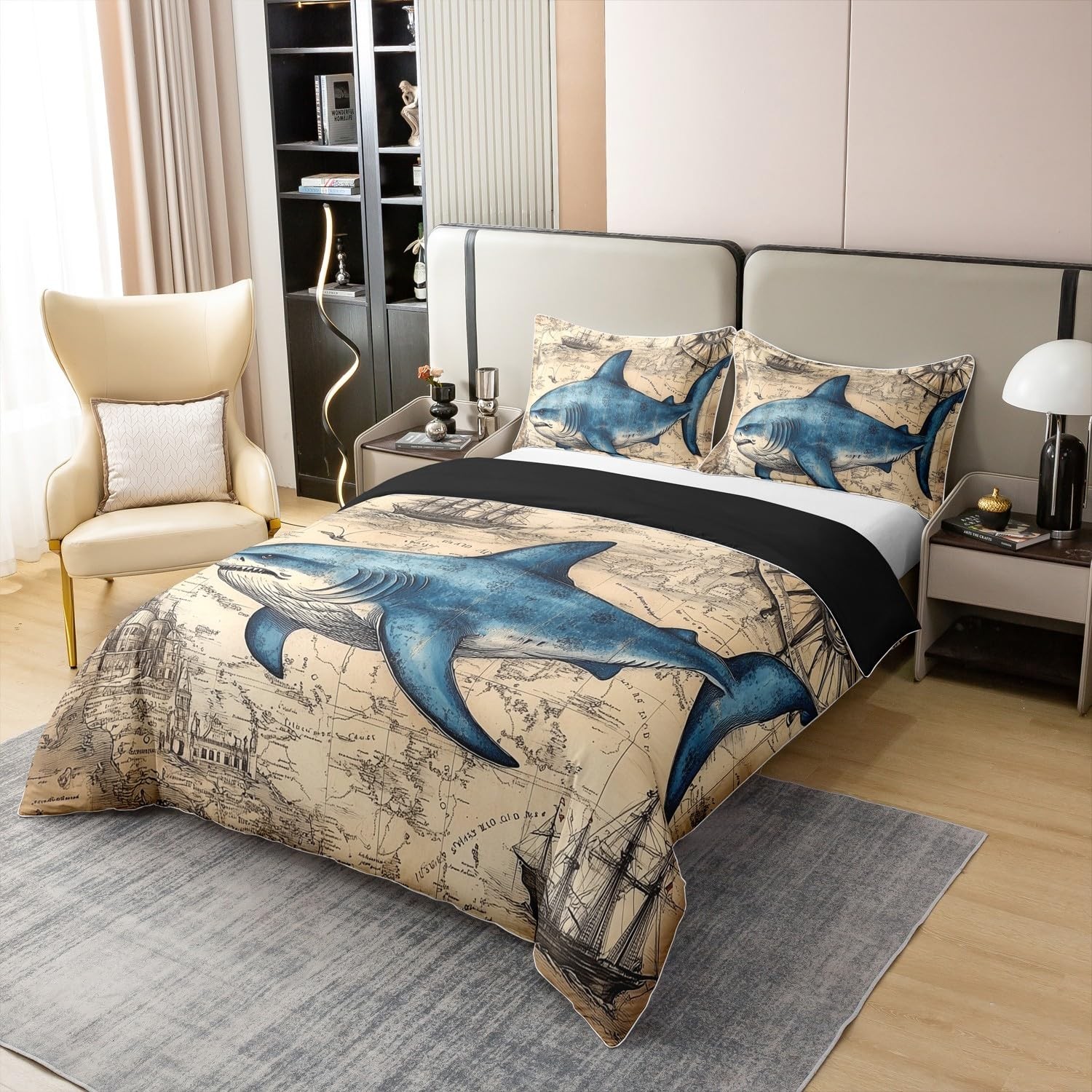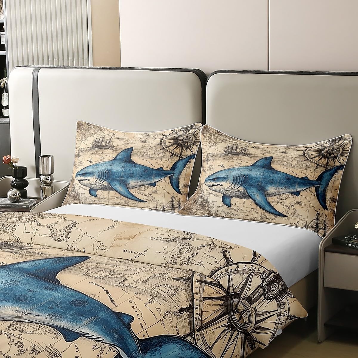 как выглядит Nautical Sailboat Cotton Duvet Cover Set Twin Size Shark Marine Life Bedding ... фото