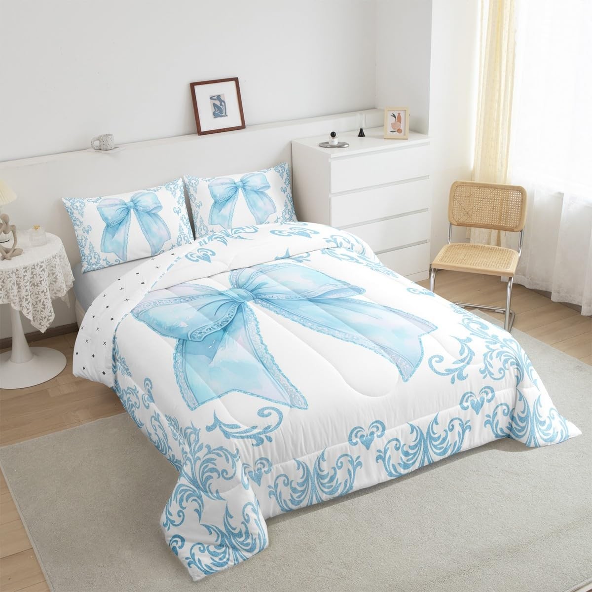 как выглядит Girls Pretty Ribbon Blue Bow Bedding Set Full Size Blue Damask Comforter Set ... фото