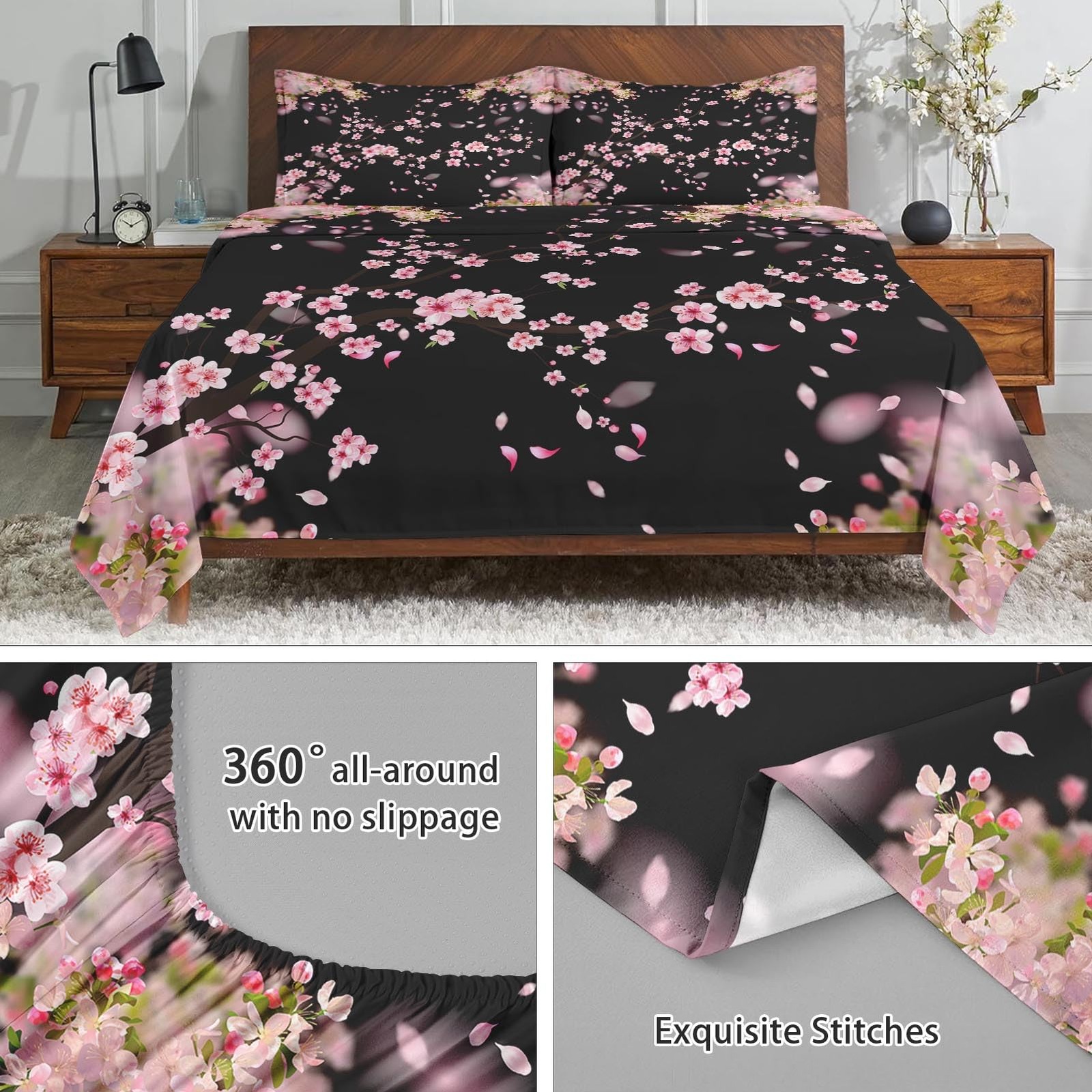 Queen Size 4 Pcs Bed Fitted Sheet Set with 14 Deep Pocket, Blossom Cherry Fl...