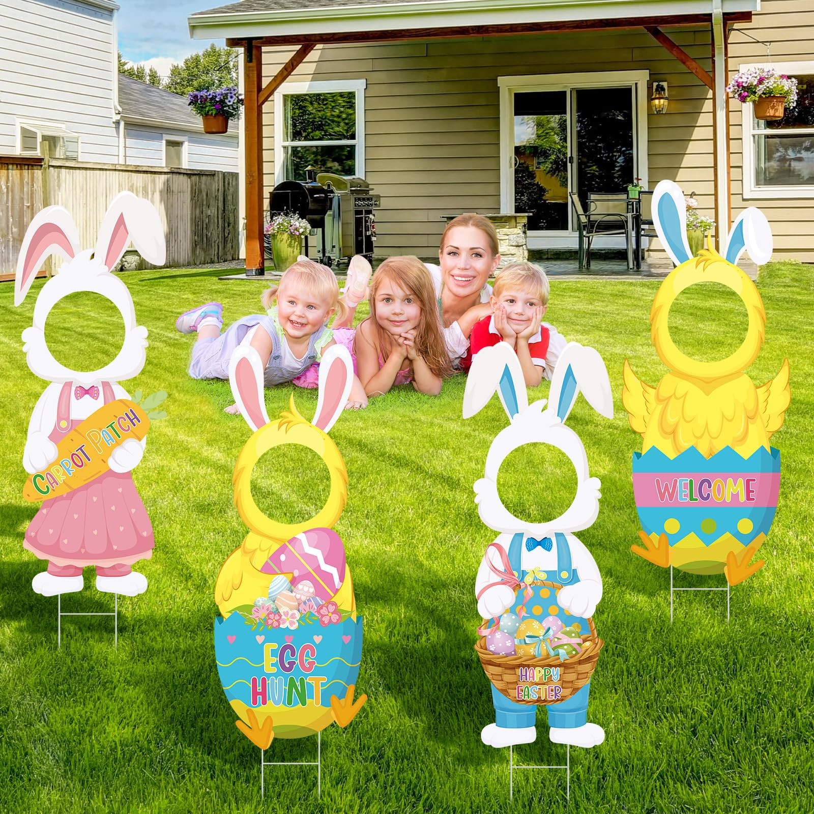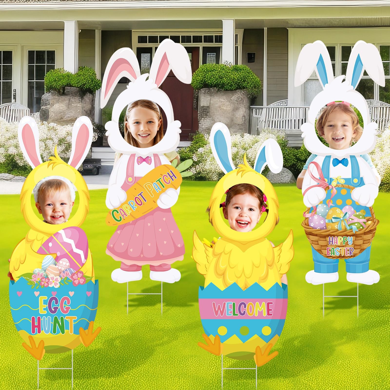 4 Pcs Easter Face Yard Outdoor Decorations Large Bunny Chick Lawn Sign with S...