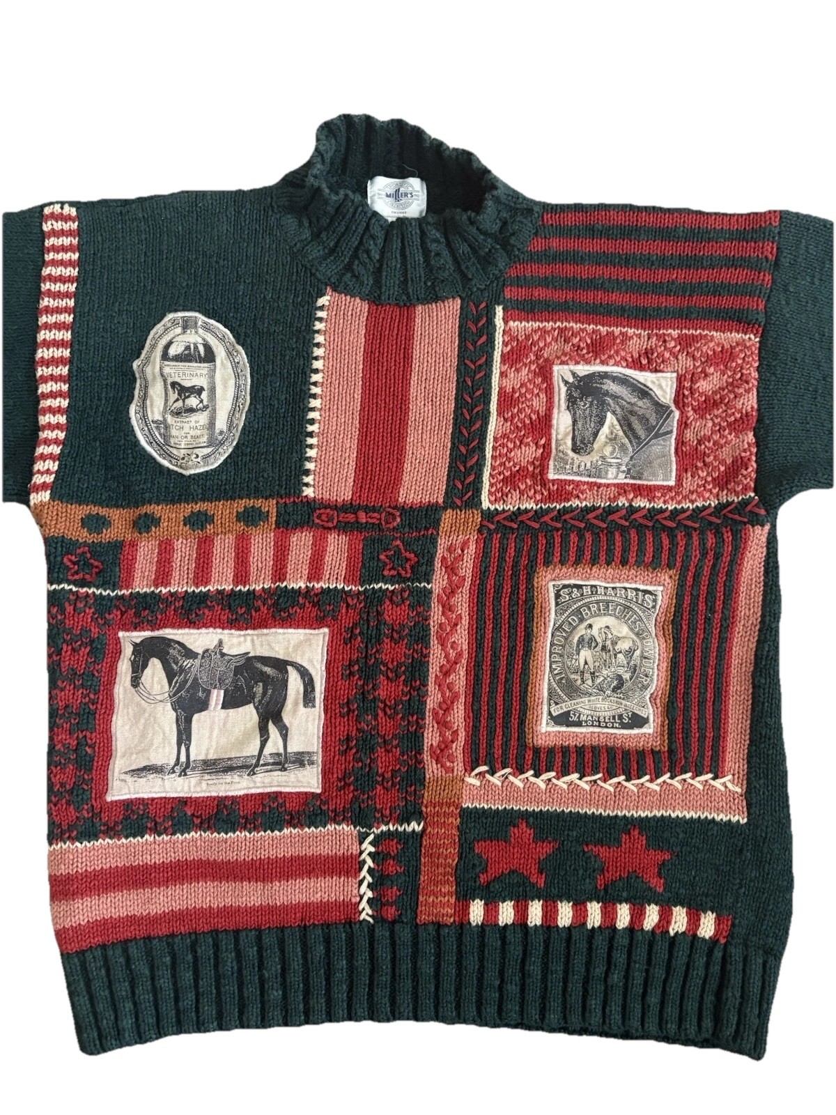 Vintage Miller s Patchwork Horse Sweater L Green Ramie Cotton Equestrian