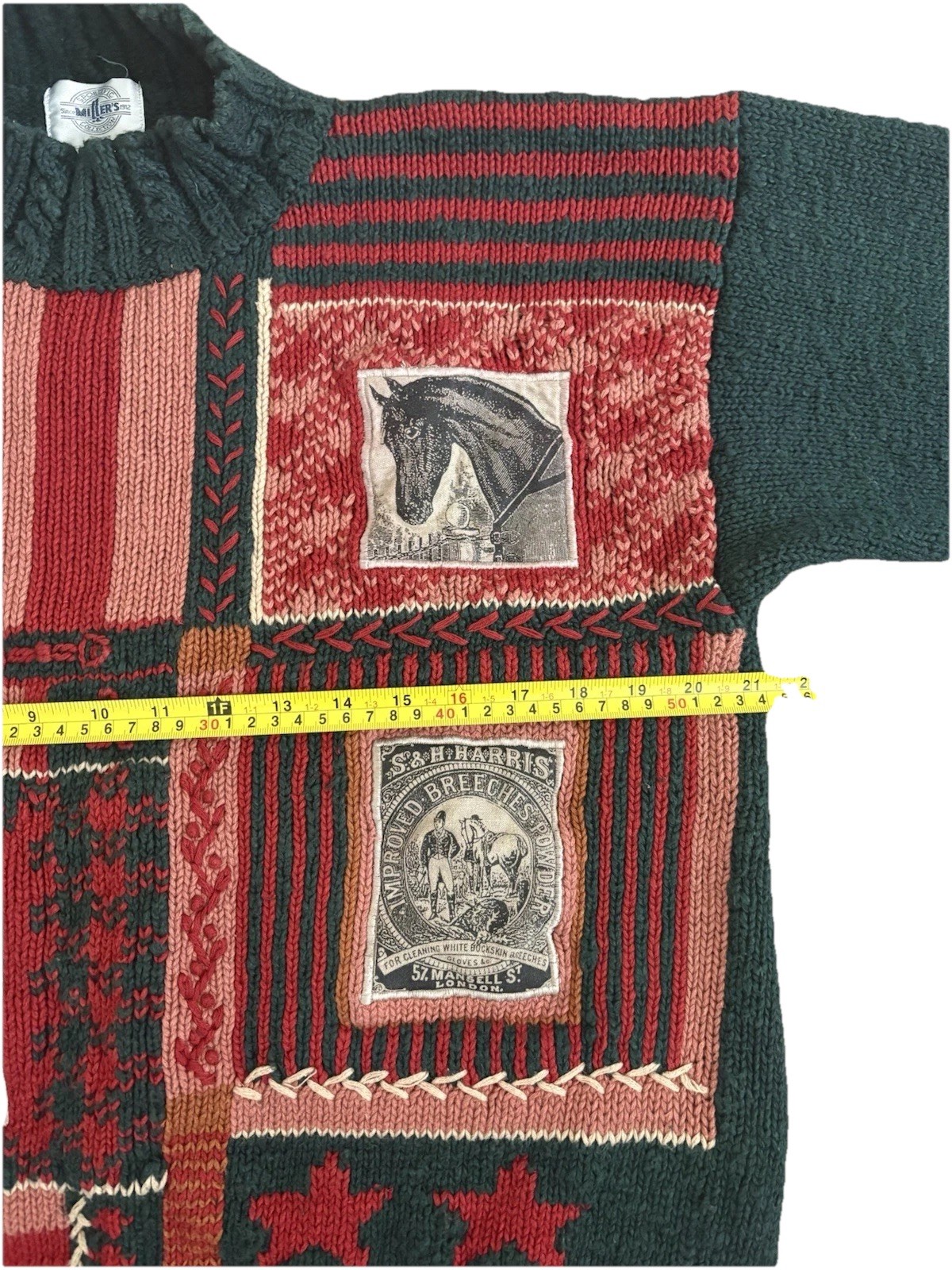 как выглядит Vintage Miller s Patchwork Horse Sweater L Green Ramie Cotton Equestrian фото