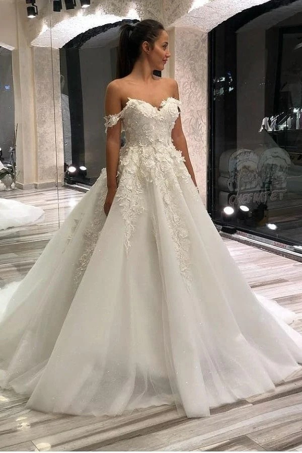 Off Shoulder Wedding Dresses Lace Appliques Sweep Train A Line Bridal Gowns