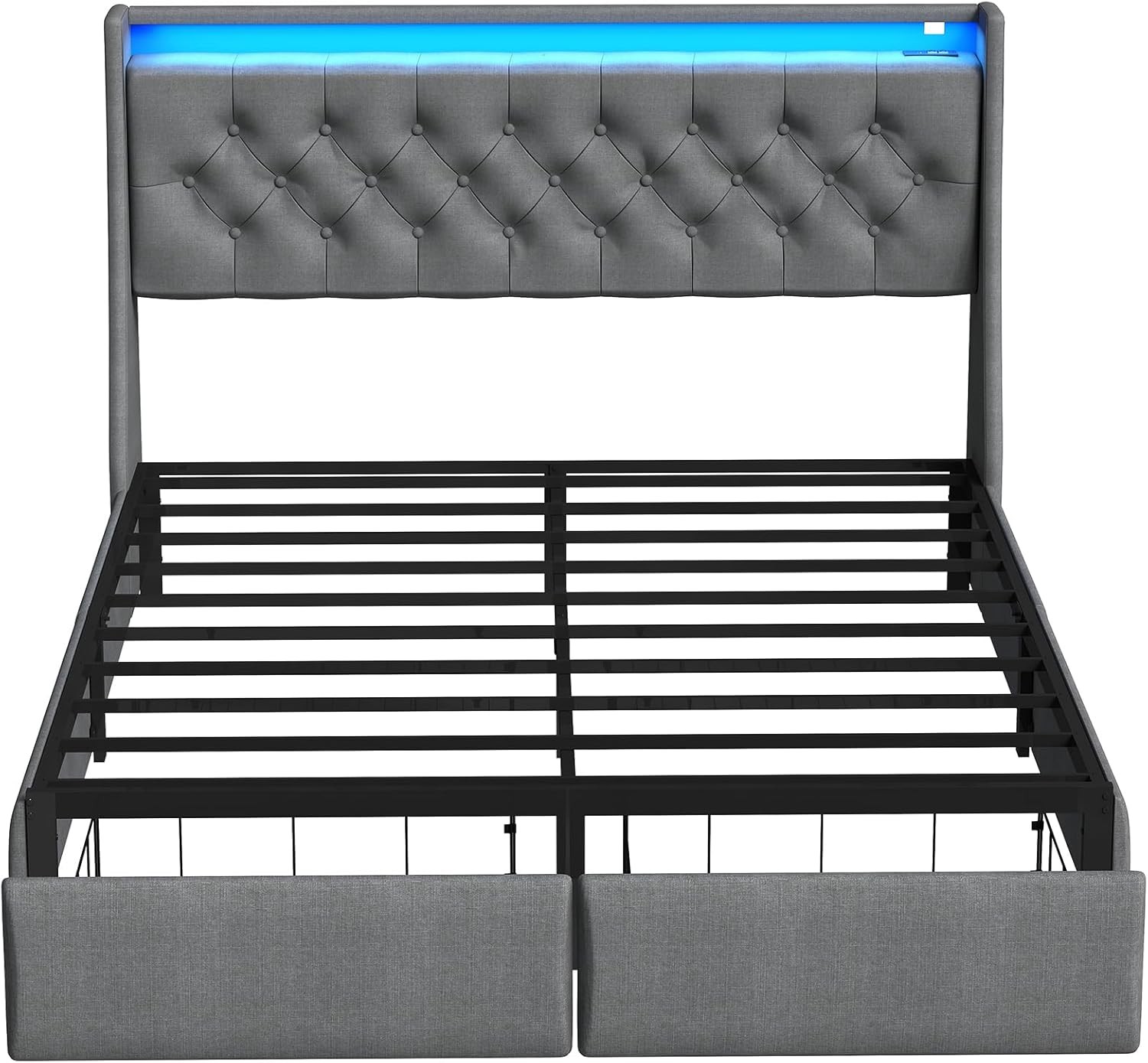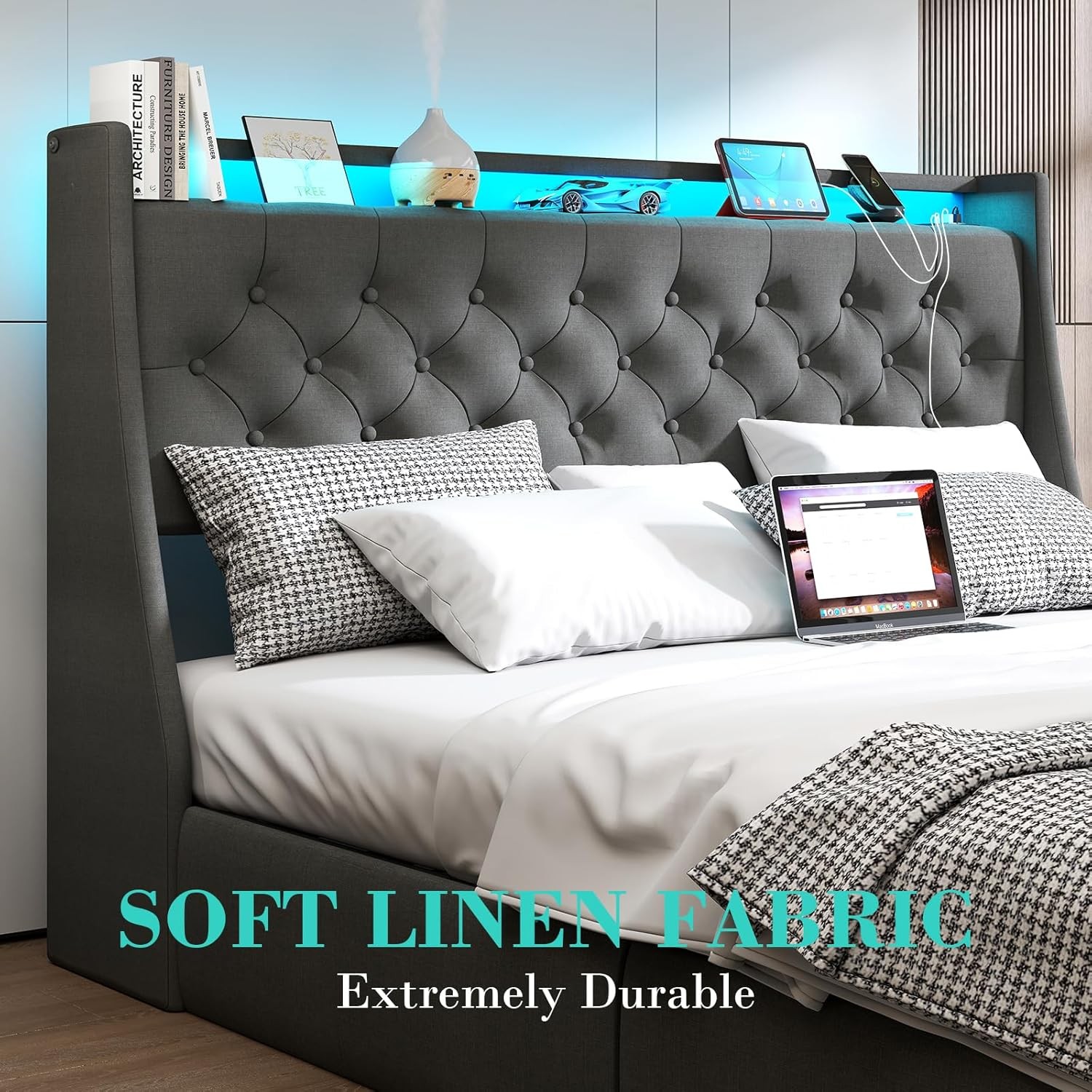 Особенности: 2 Storage Drawers, LED Light, Fade Resistant,, No Box Spring Needed, Squeak Resistant, Button Tuffed, Upholstered Wingback, Charging Station