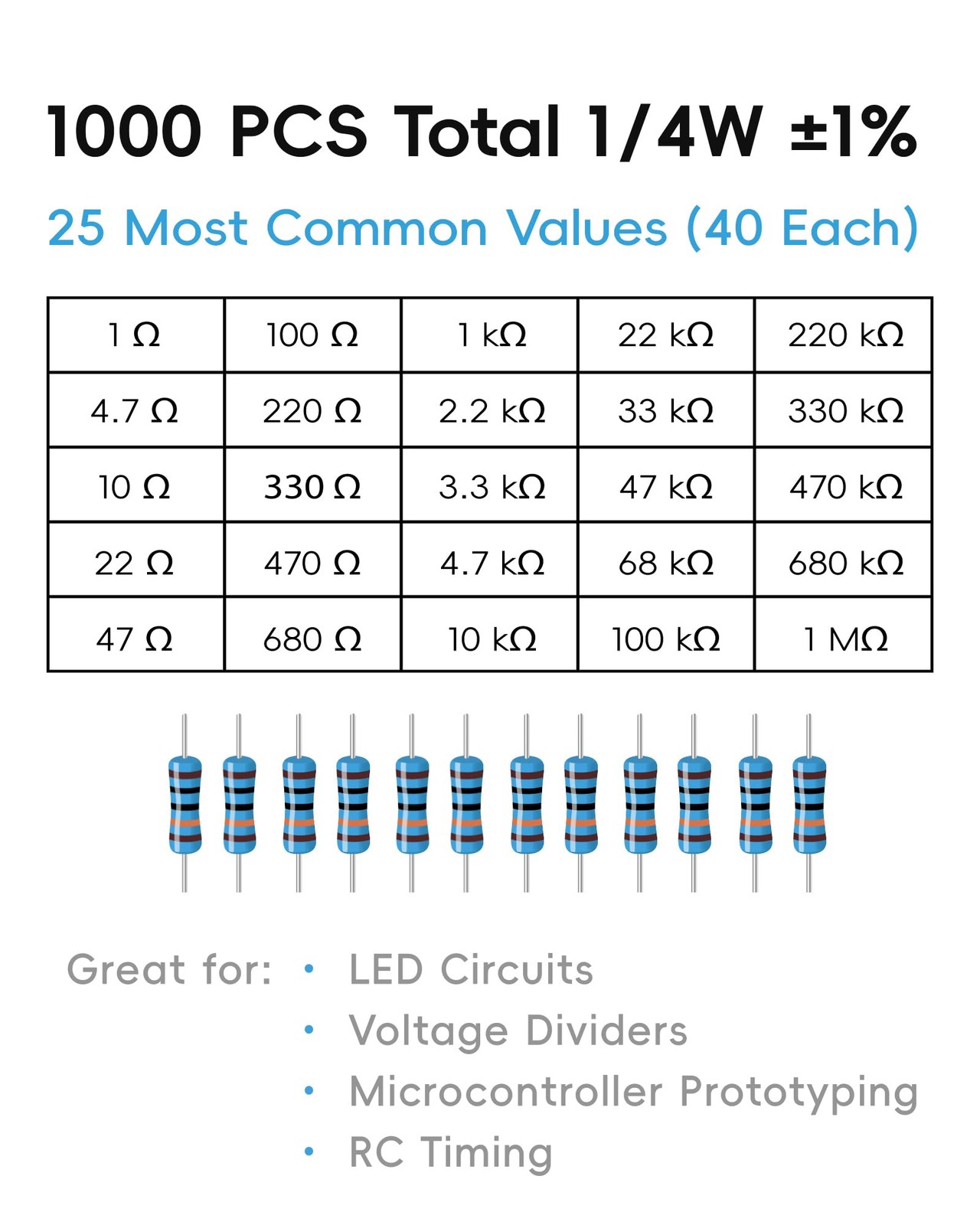 1000 PCS Resistor Kit 1/4 W -1 Premium Metal Film Resistors Assortment...