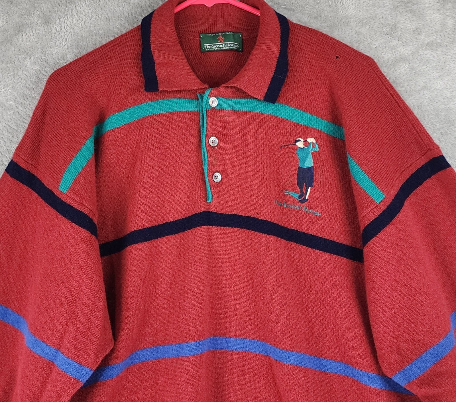 The Scotch House Sweater Mens Large Red Striped Embroidered Golfer Vintage Wool