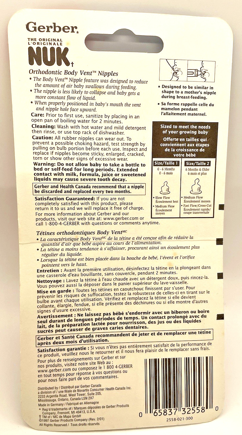 Gerber Nuk Orthodontic Body Vent Nipples 2 pack brown VTG Vintage 1997