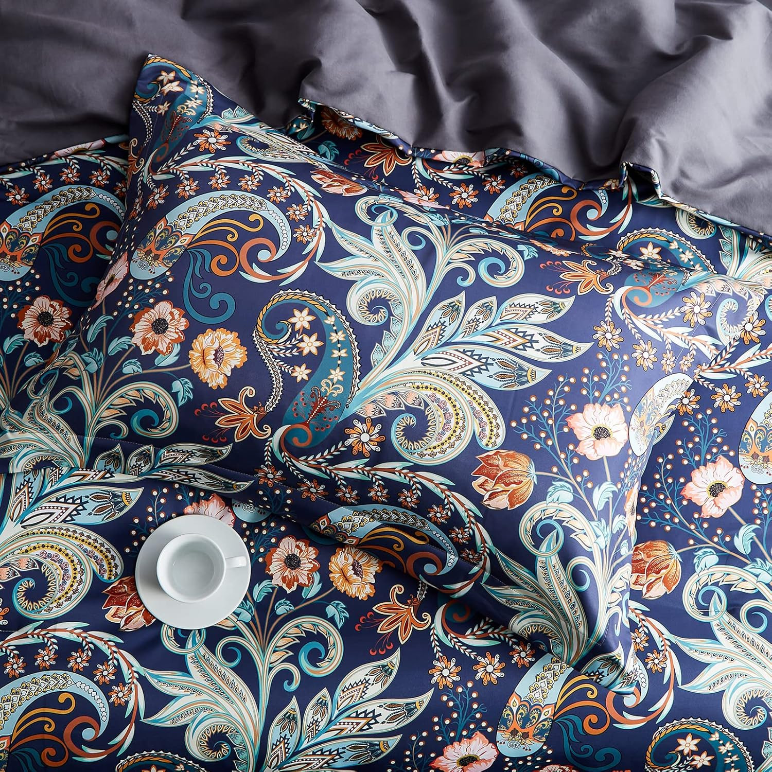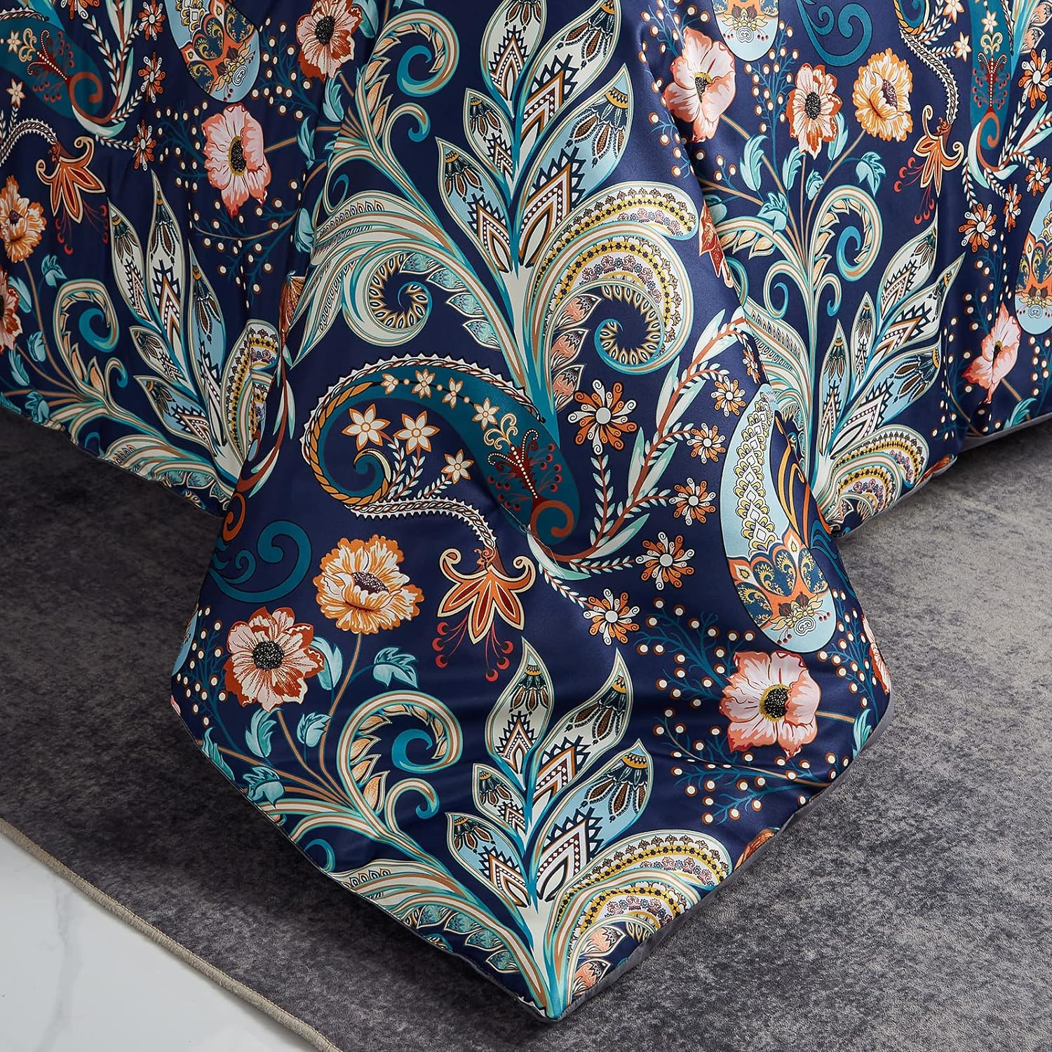 как выглядит 7 Piece Paisley Flower Comforter Bed in a Bag Set King Size Luxury Dark Blue Vin фото