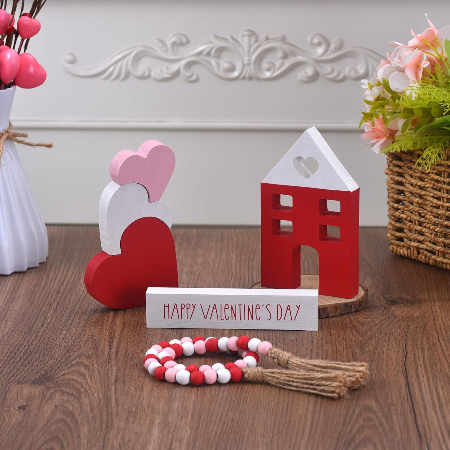Wooden Valentine'S Day Decorations Pink Red Heart Wood Bead Garland Gift 6-Piece