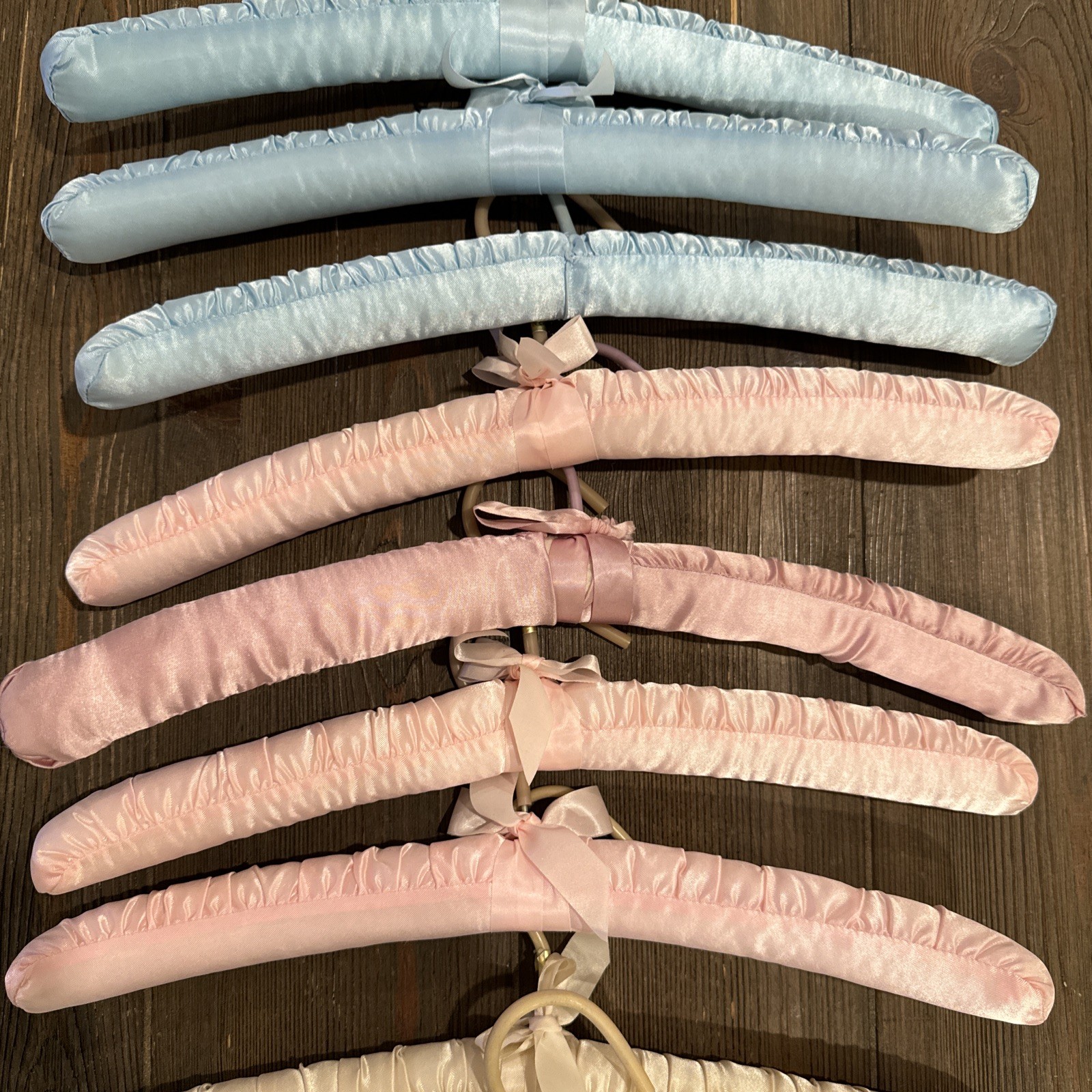 как выглядит VTG Padded Satin Hangers Boudoir Lingerie Lot of 9 Pink Blue Ivory фото