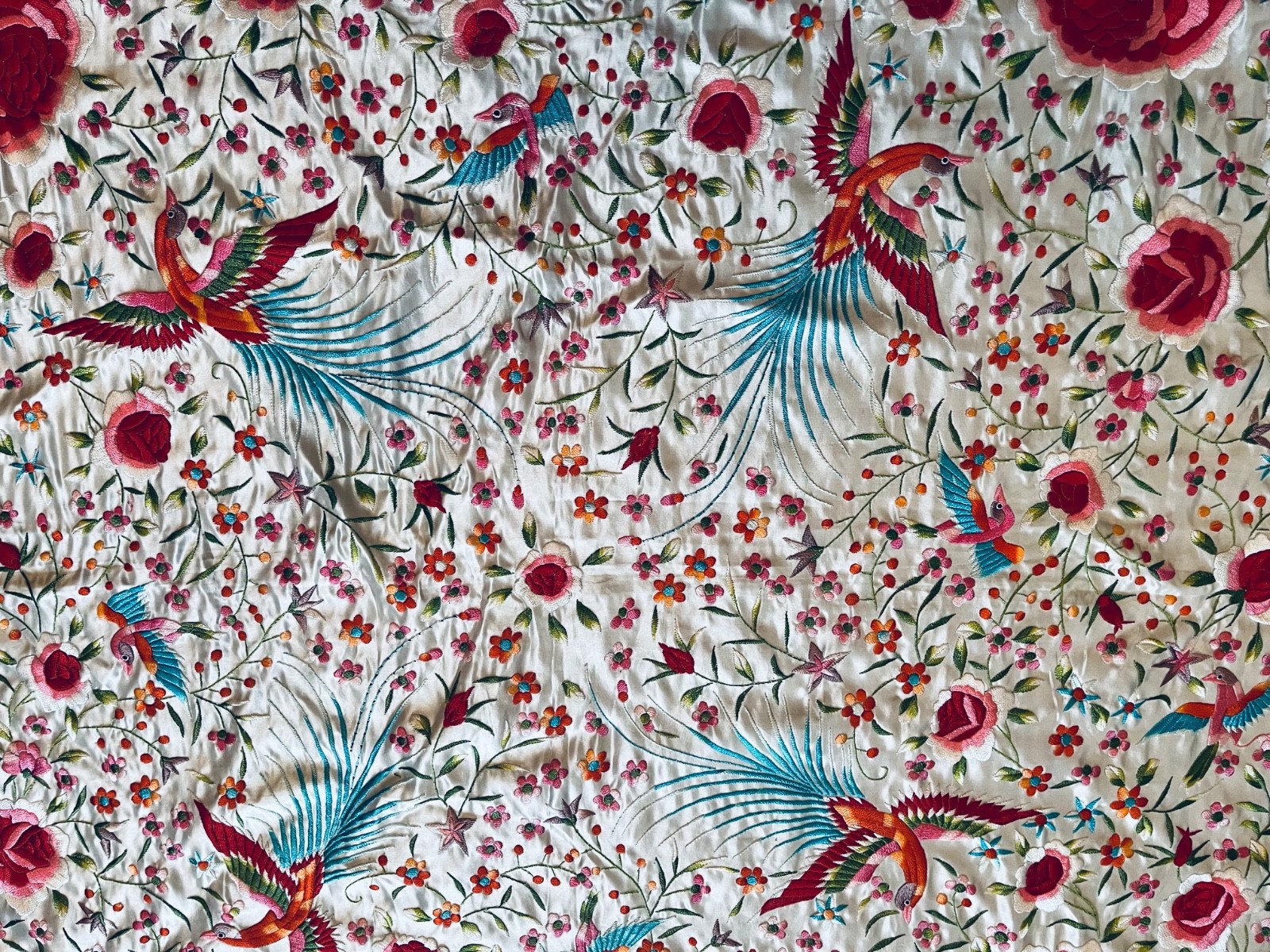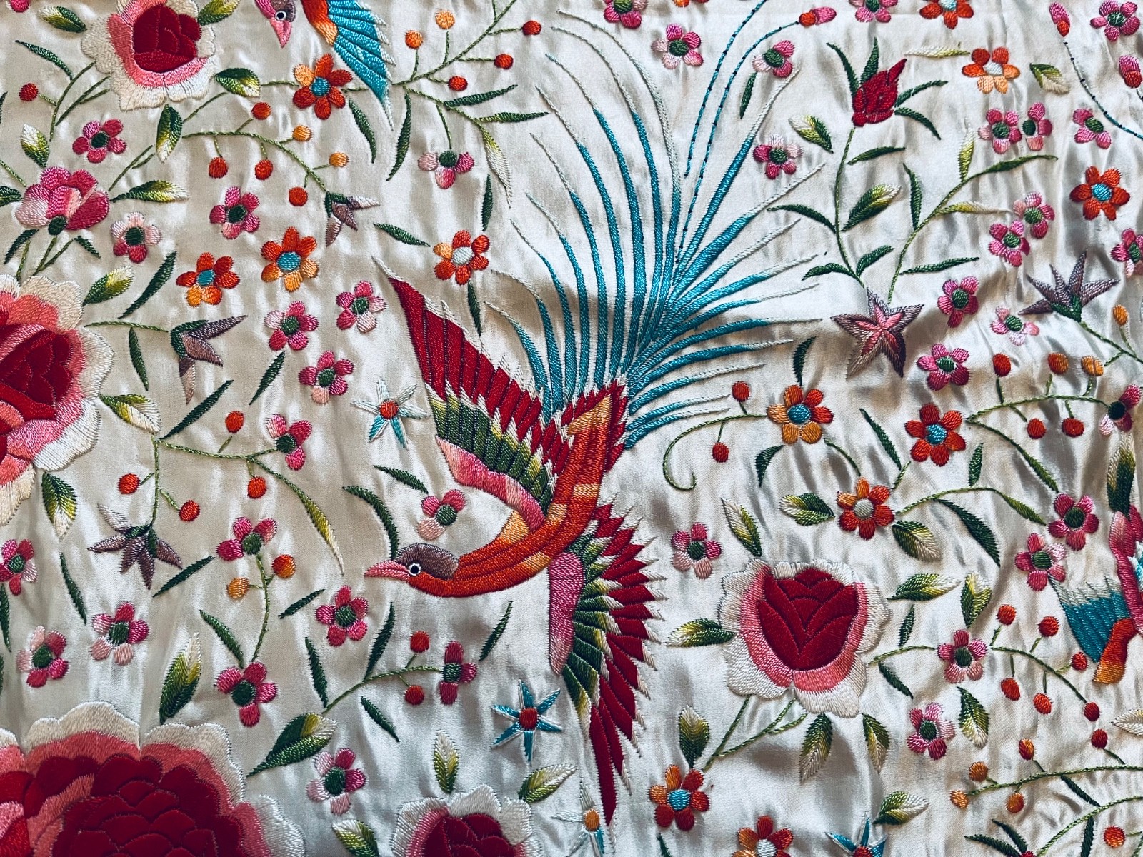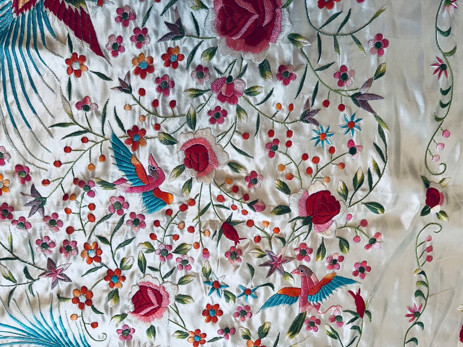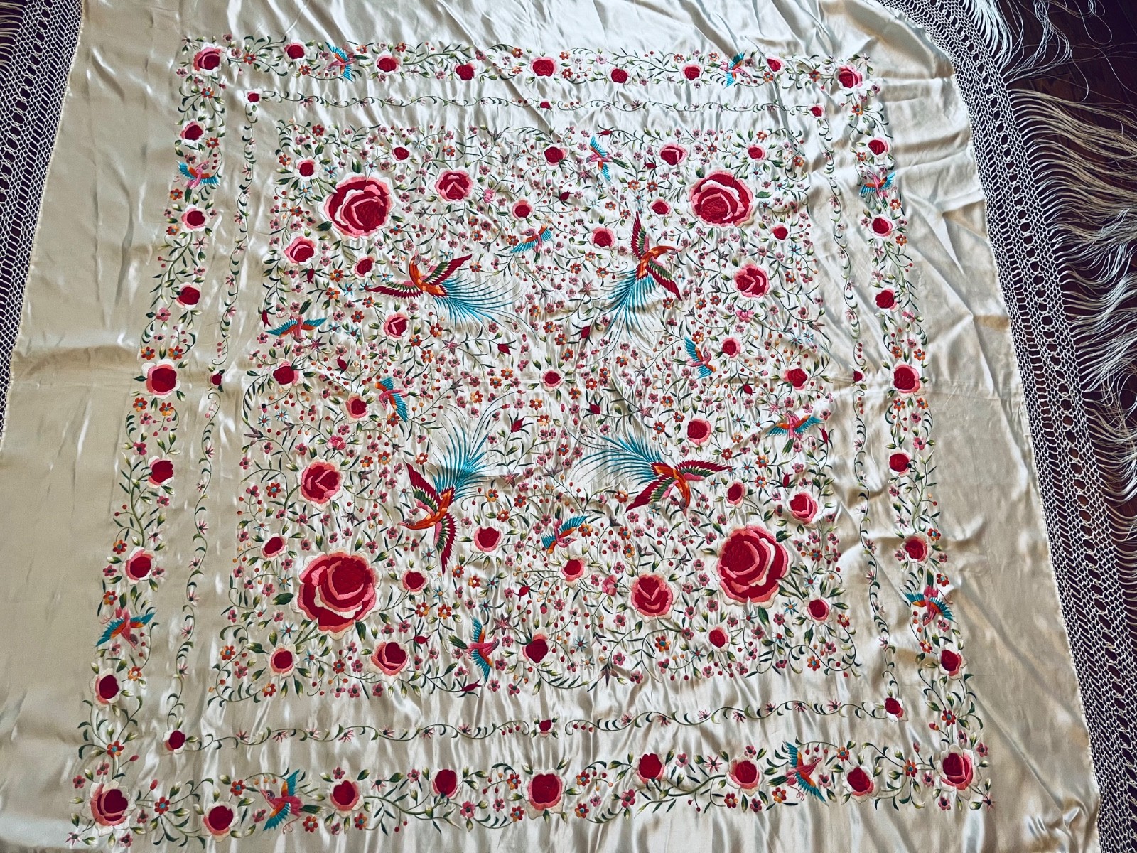 A stunning large vintage embroidered silk piano scarf/shawl hand knotted fringe