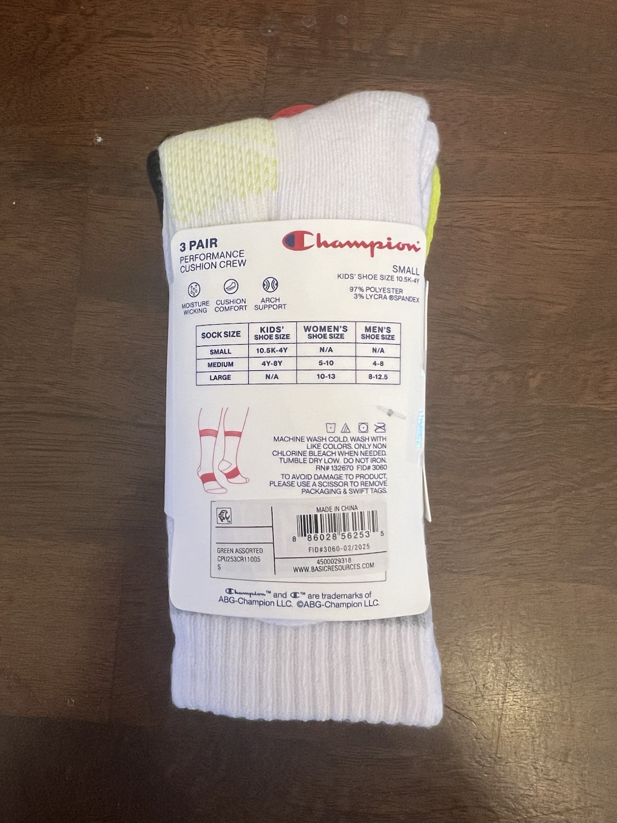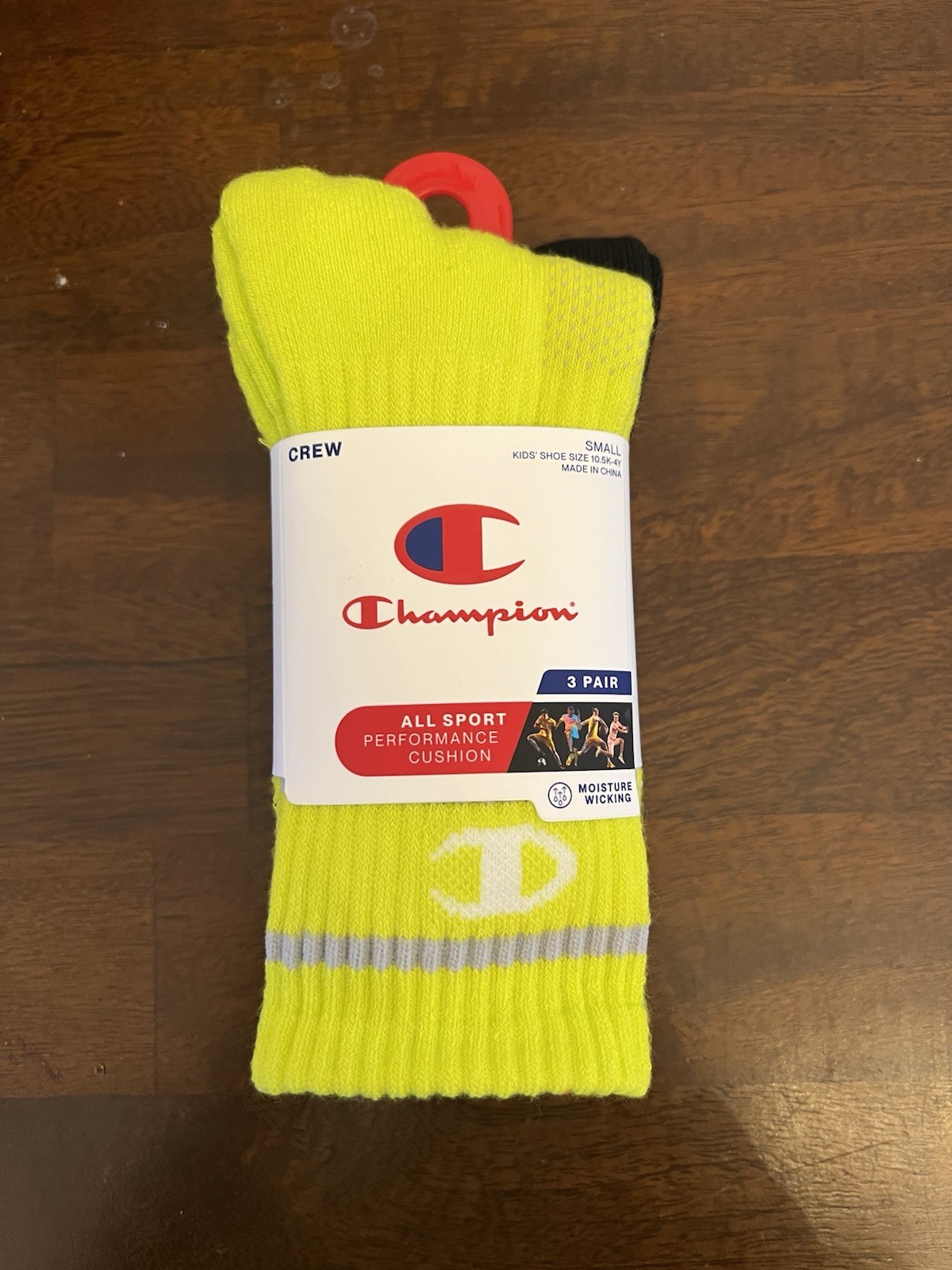 Kids Yellow Black White Champion Crew Socks Size Small 10.5k-4Y