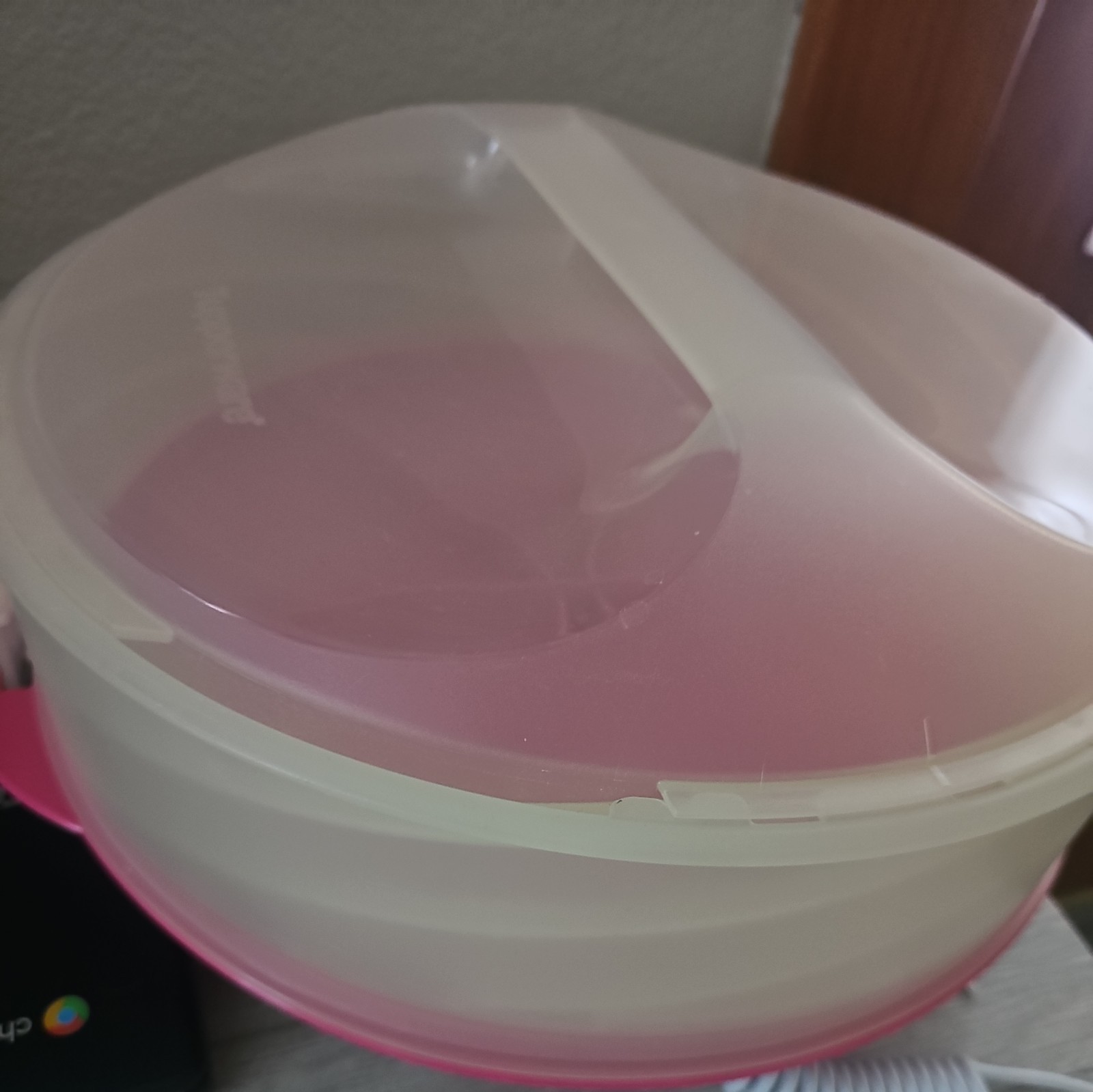 как выглядит TUPPERWARE EXPANDABLE CAKE CARRIER 12" PIE TAKER PINK COLLAPSIBLE VINTAGE фото