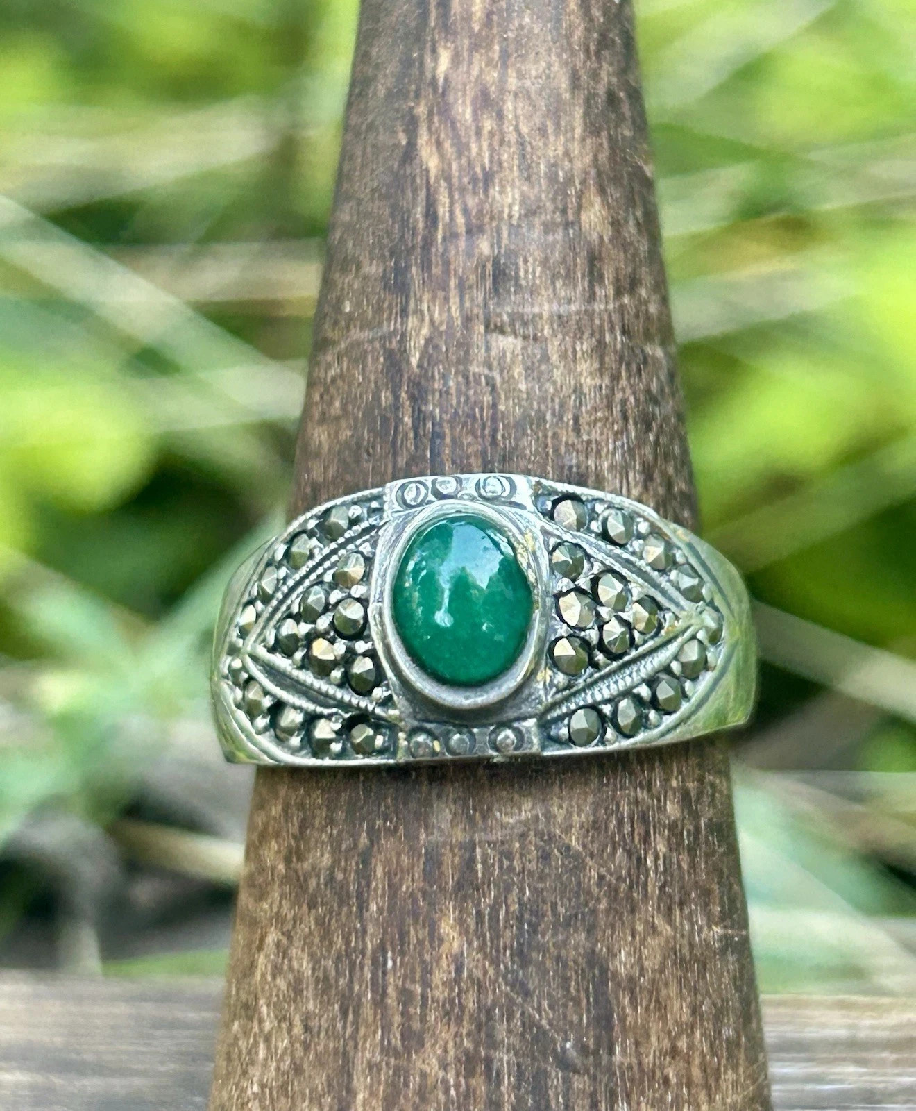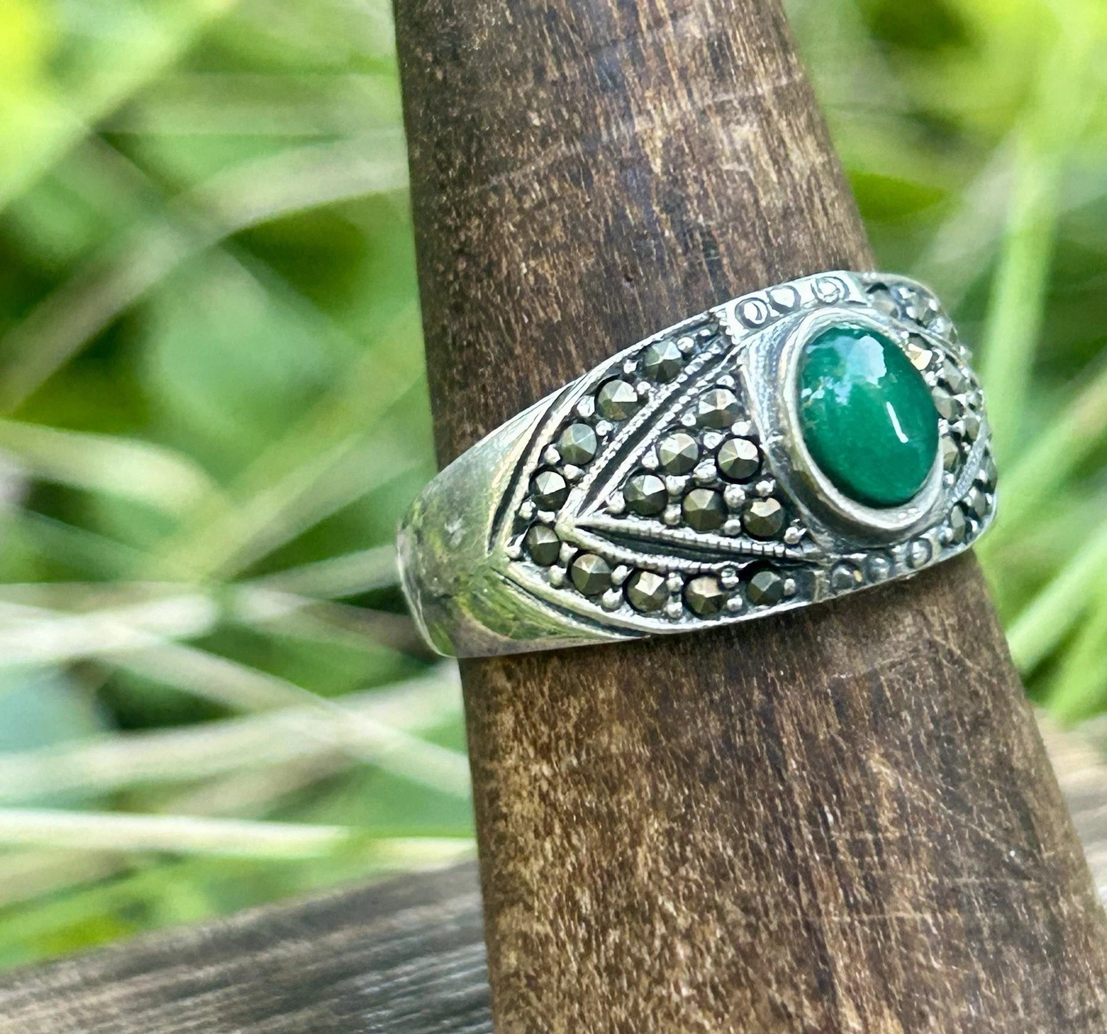 как выглядит Sterling Silver Ring Marcasite Green Stone Vintage 925 фото