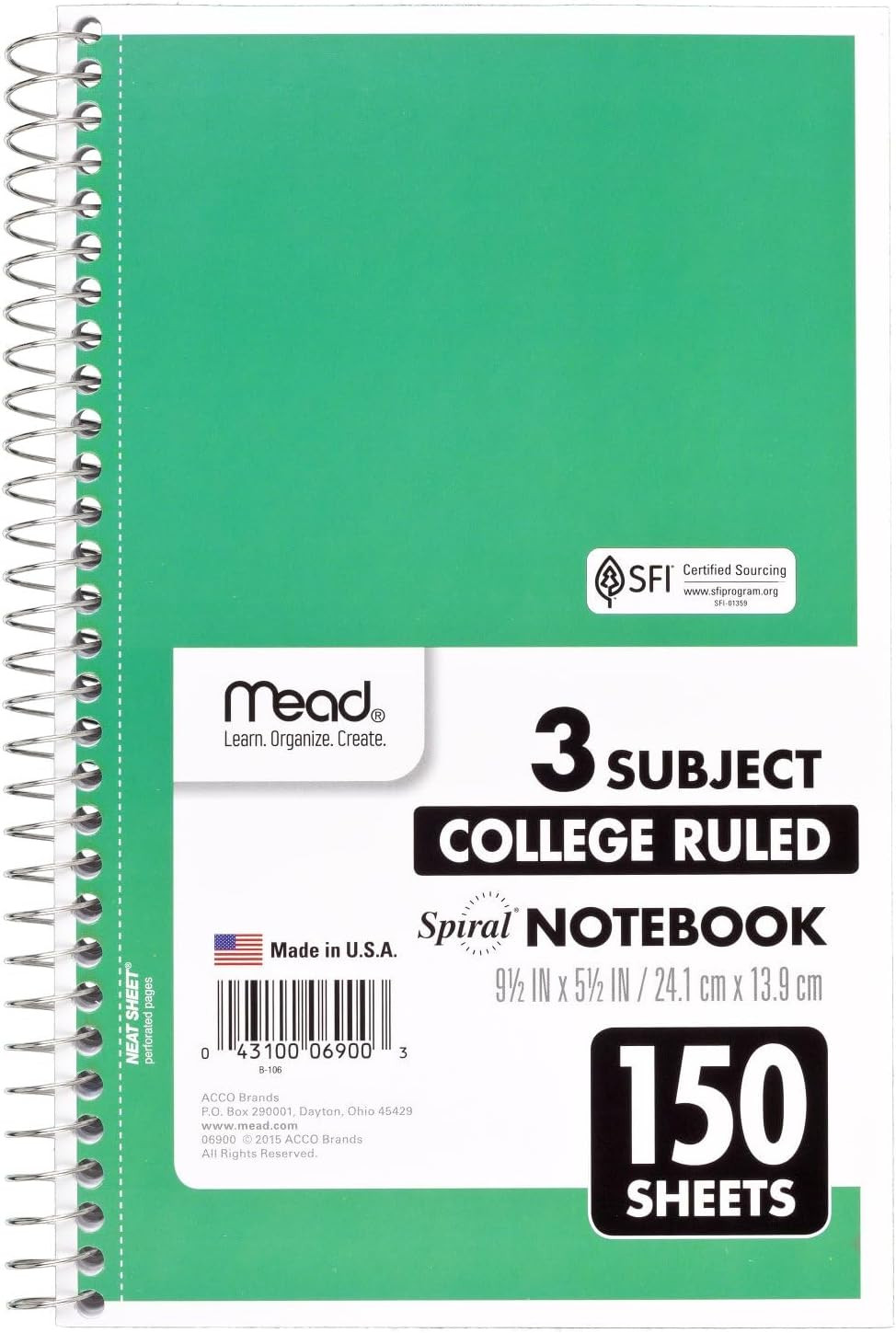 Small Spiral Notebook, 3-Subject, College Ruled Paper, 9-1/2 x 5-1/2, 150 Shee