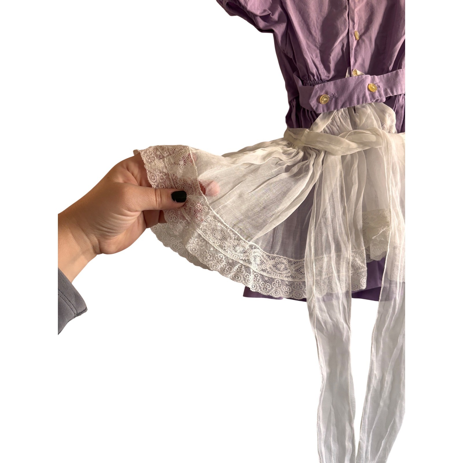 как выглядит Vintage cottage girl dress in color purple and white with white lace size 2t/3t фото