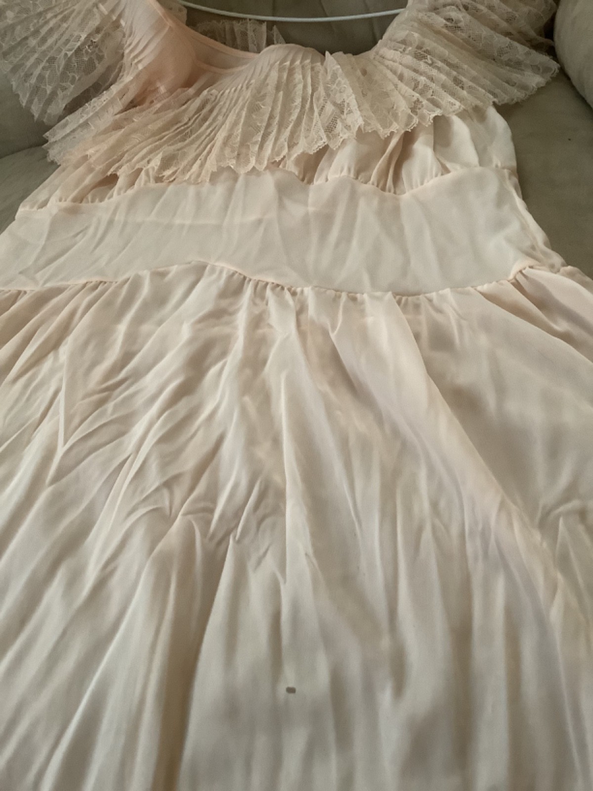 как выглядит VTG Van Raalte Nightgown S M Peach Sheer Chiffon Long Lace pleated USA Sheerio фото