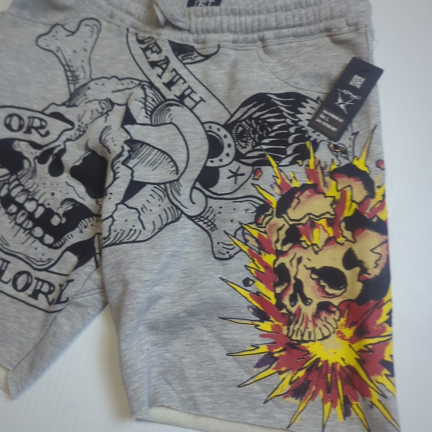 New Ed Hardy Men's Fleece Shorts Large Gray Tigger Logo Pockets Tattoo Fray Hems