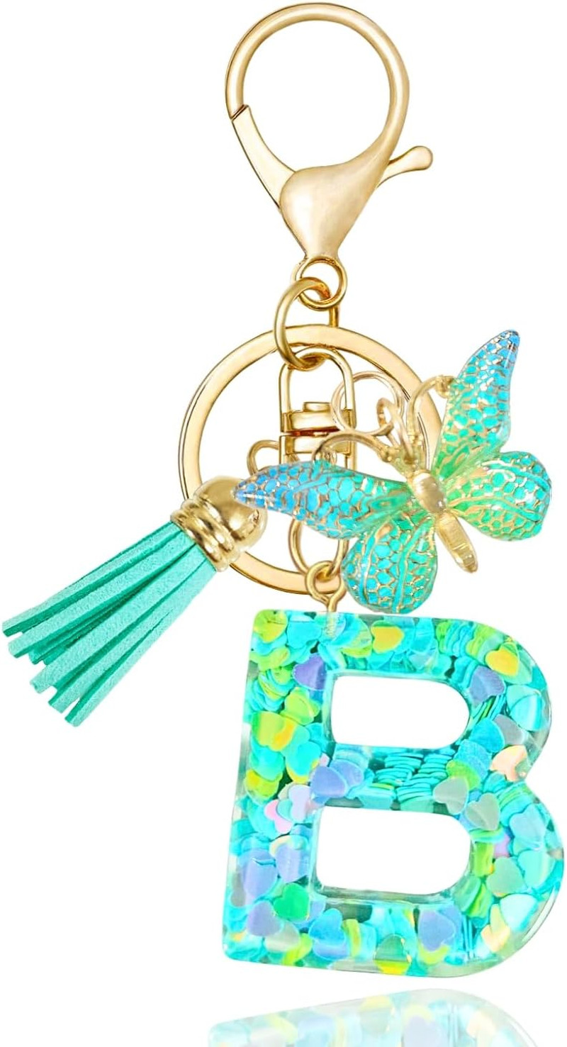 Purple-Blue Pink Green Resin Alphabet Initial Letter Keychain Tassel Butterfly K
