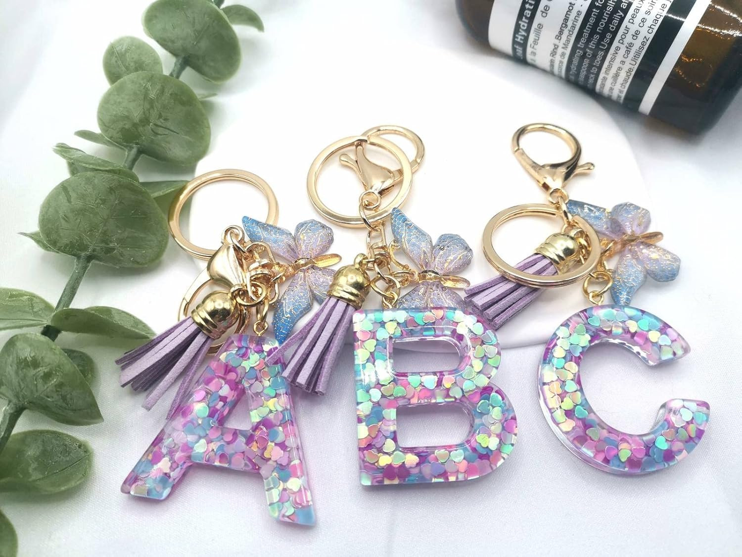 Purple-Blue Pink Green Resin Alphabet Initial Letter Keychain Tassel Butterfly K