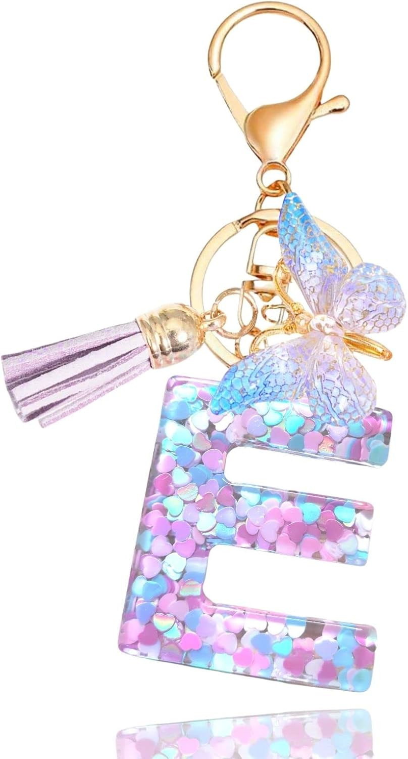 Purple-Blue Pink Green Resin Alphabet Initial Letter Keychain Tassel Butterfly K