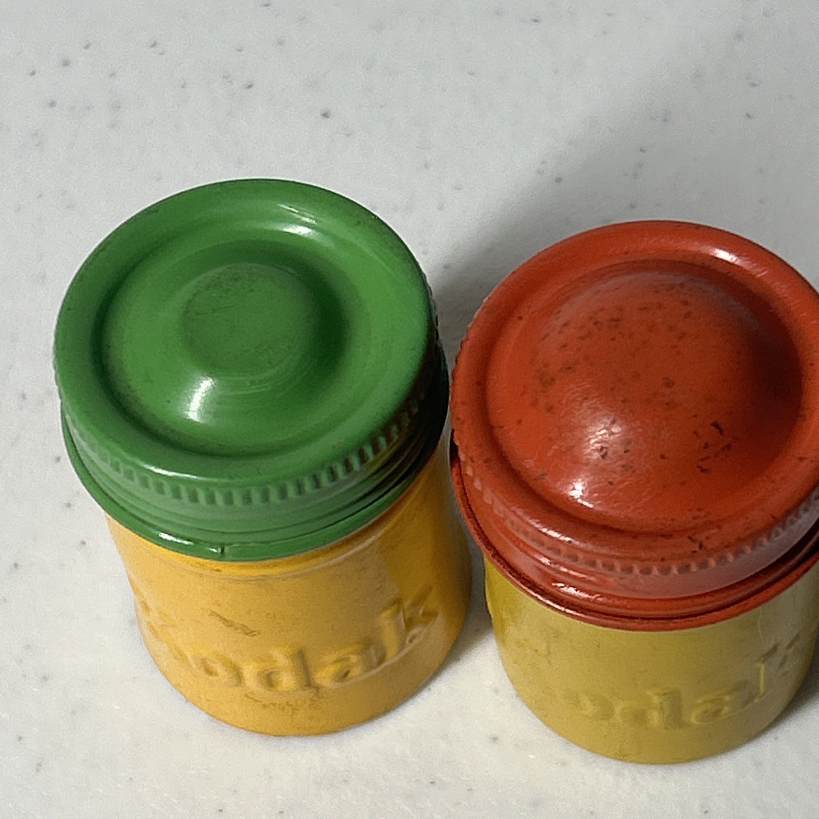 Pair Kodak Film Canisters Green Orange Vintage Screw On Lids